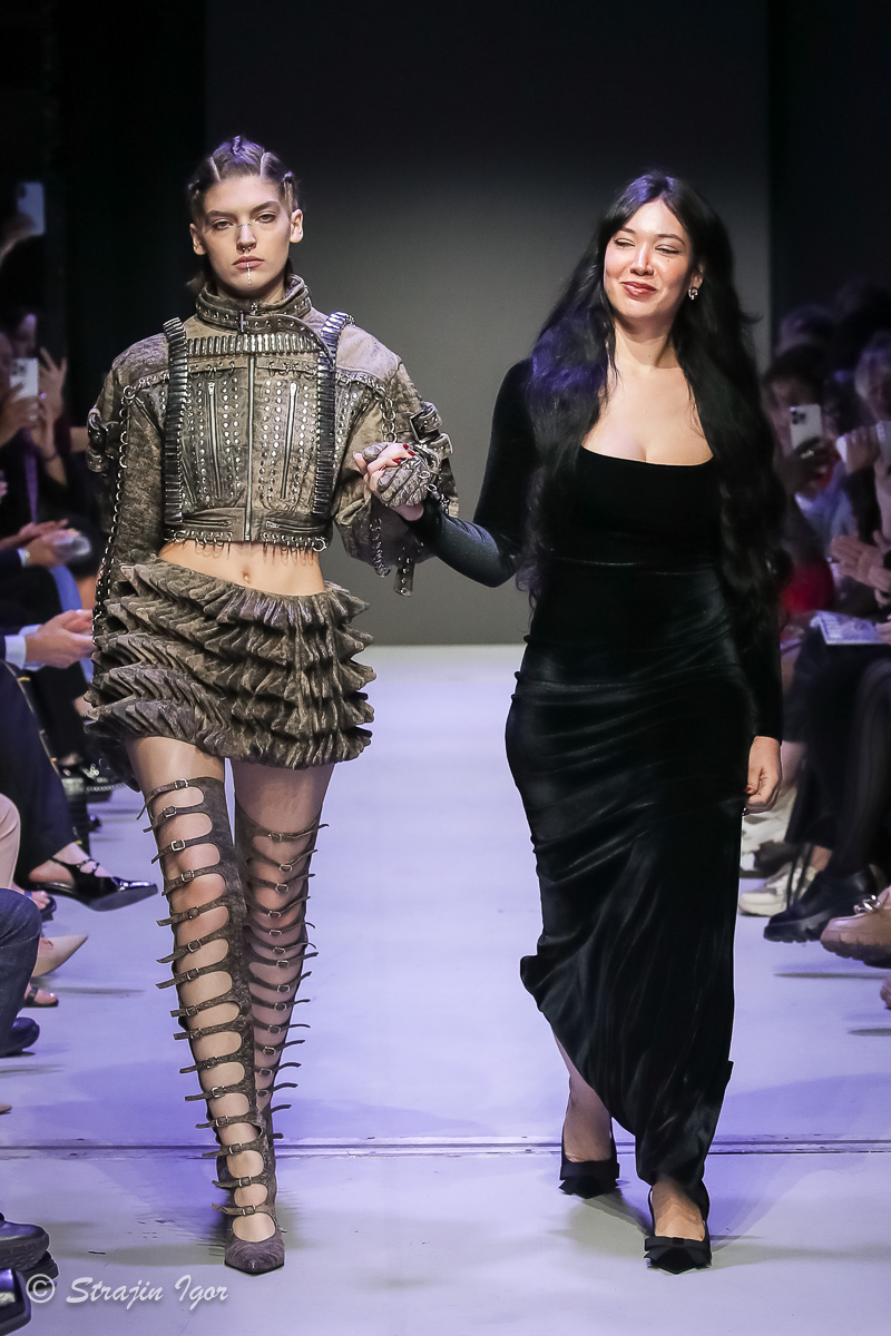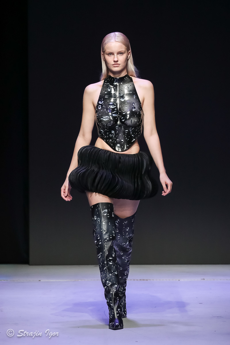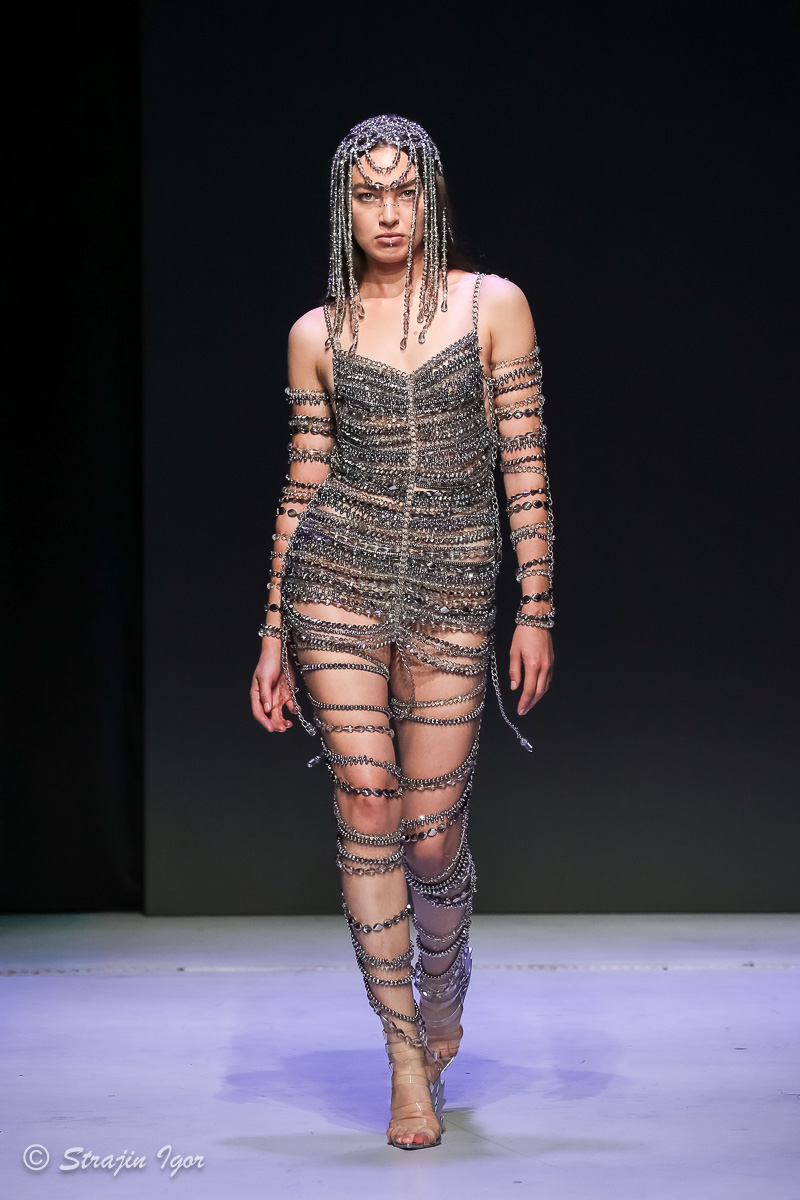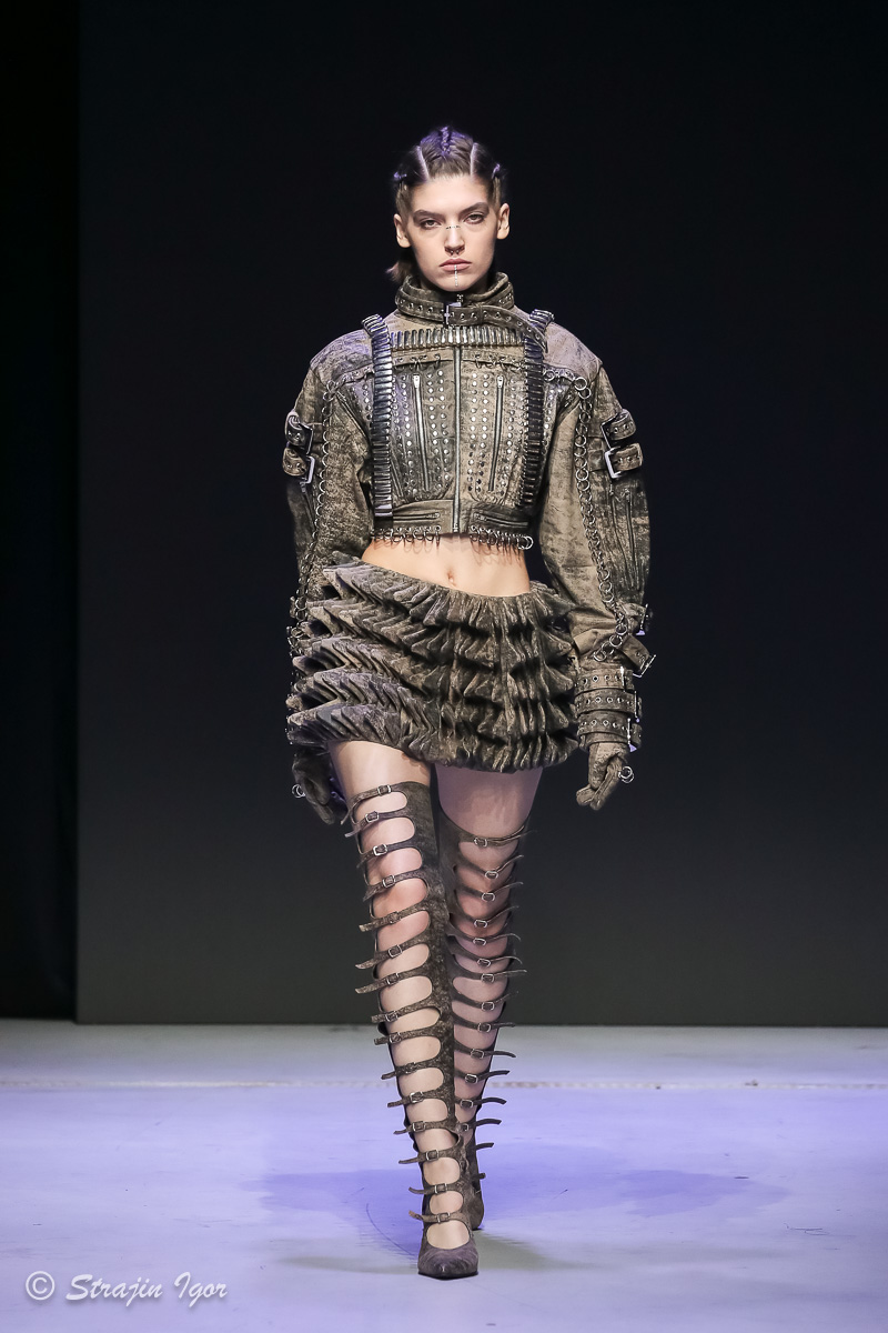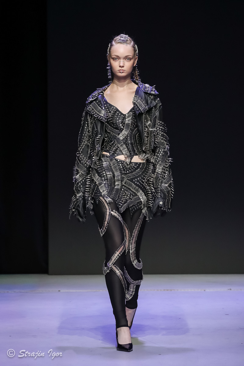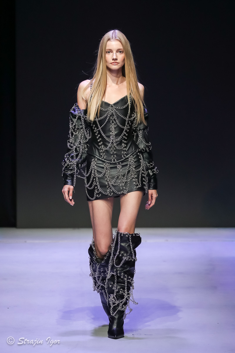 В линейке можно увидеть элементы рыцарского костюма: юбка из цепей, «железные» корсеты с инкрустацией камнями, кристальные изделия ручной сборки, топы и мини-юбки с 3D-печатью и авторскими узорами. Изделия выполнены в темной гамме, а особыми деталями стали бахрома и стразы.