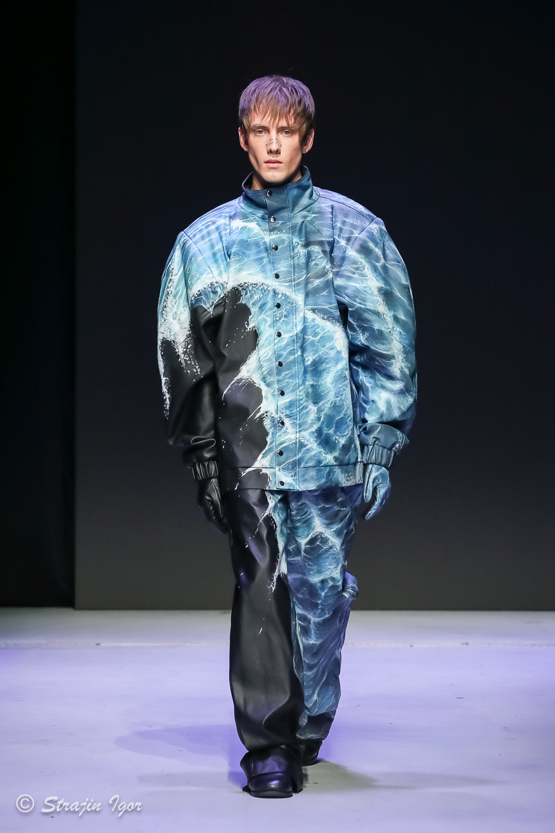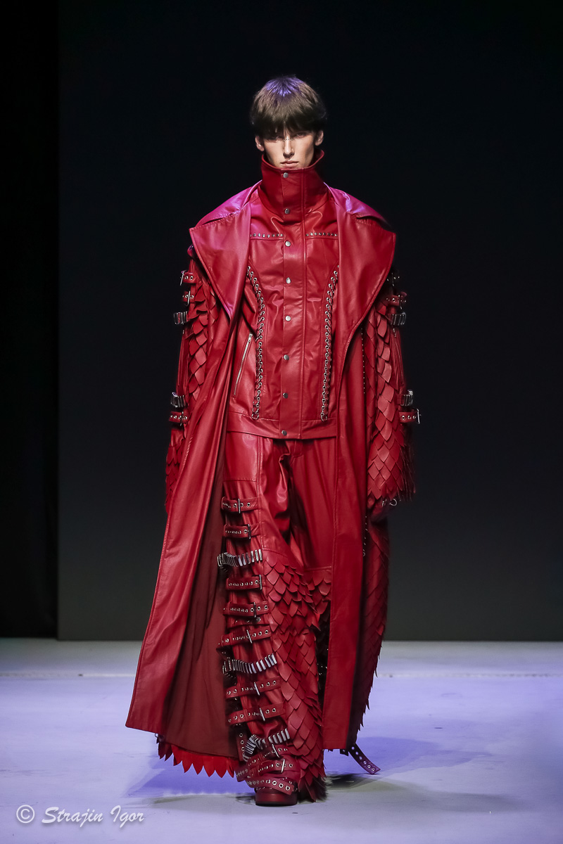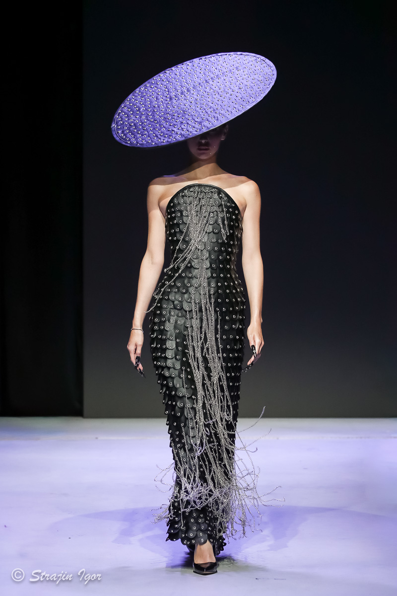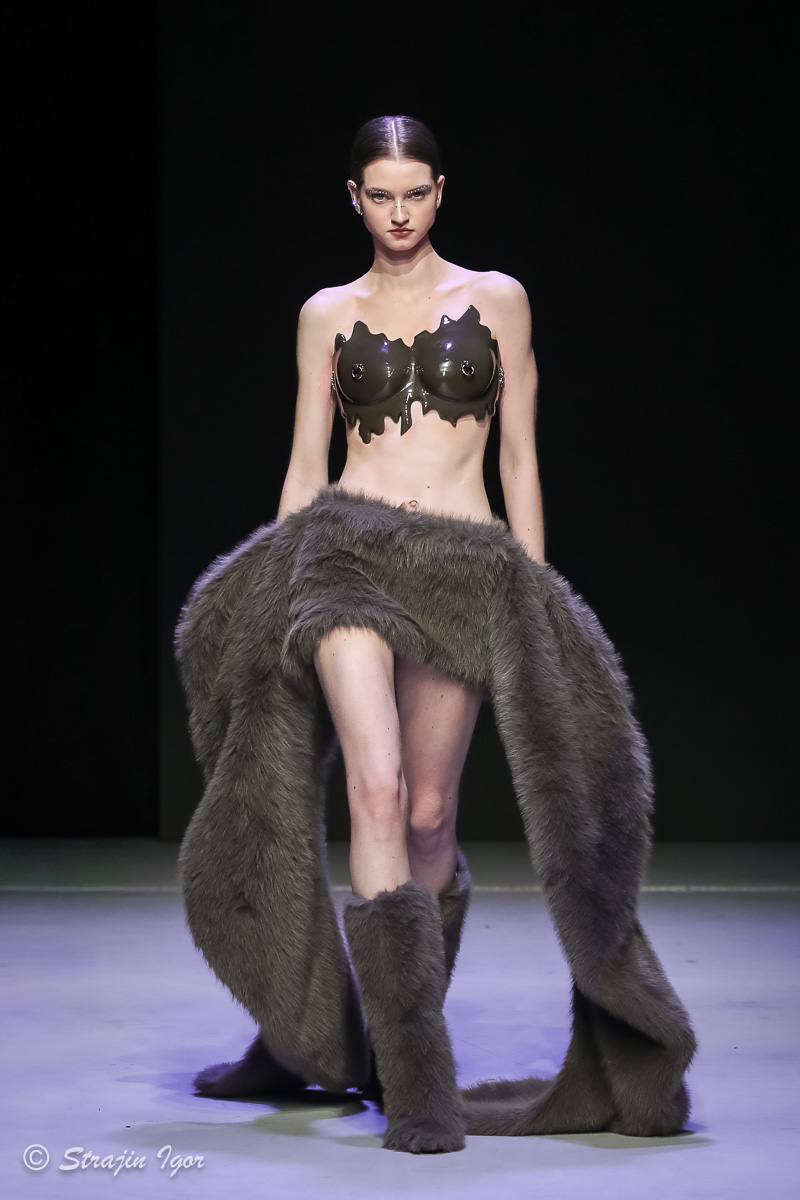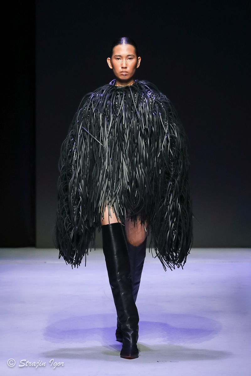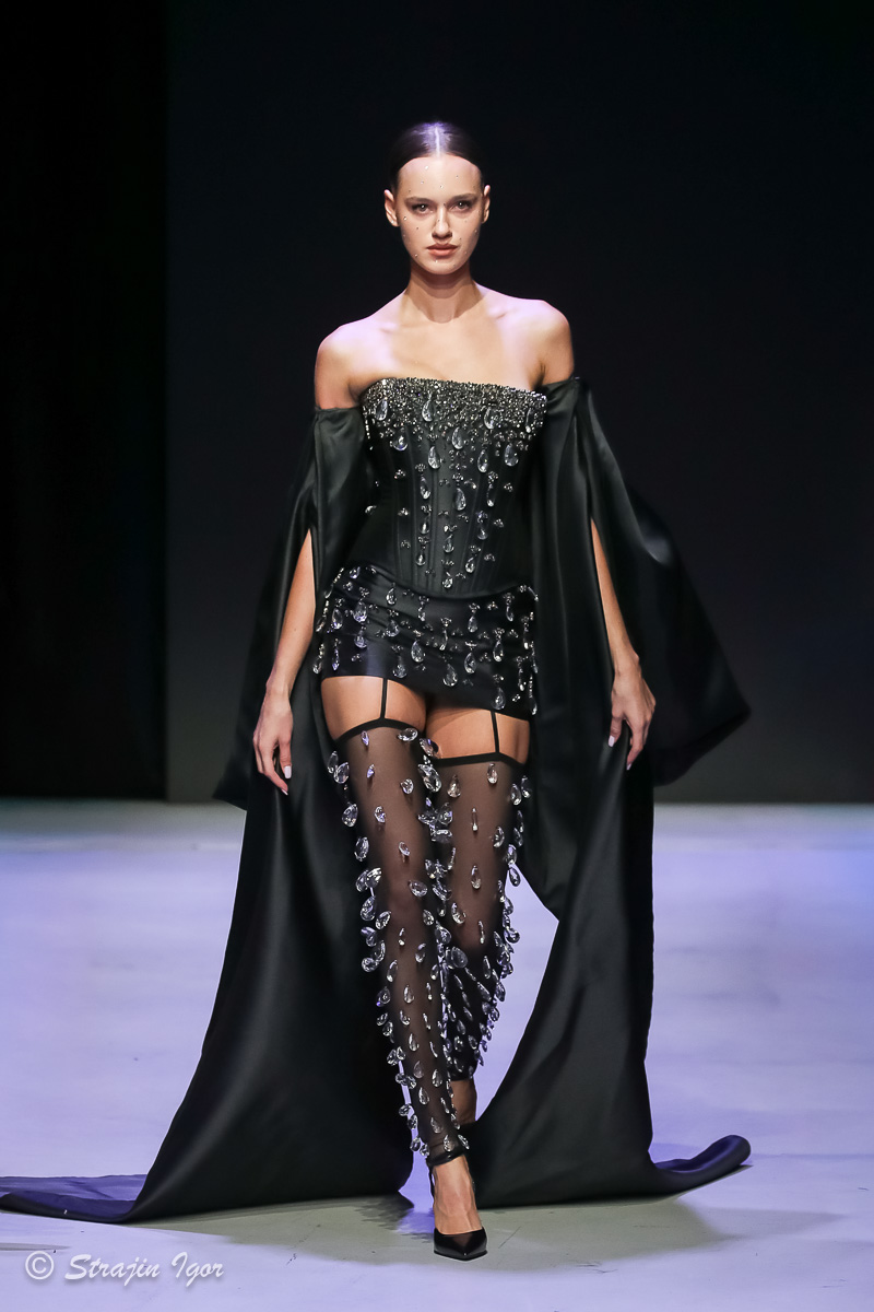 В линейке можно увидеть элементы рыцарского костюма: юбка из цепей, «железные» корсеты с инкрустацией камнями, кристальные изделия ручной сборки, топы и мини-юбки с 3D-печатью и авторскими узорами. Изделия выполнены в темной гамме, а особыми деталями стали бахрома и стразы.