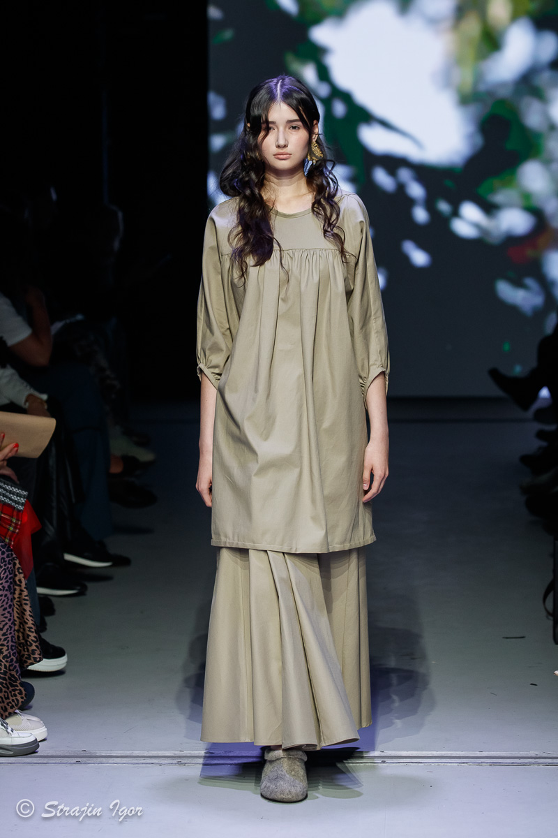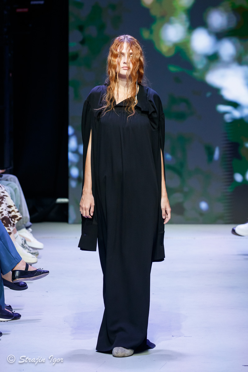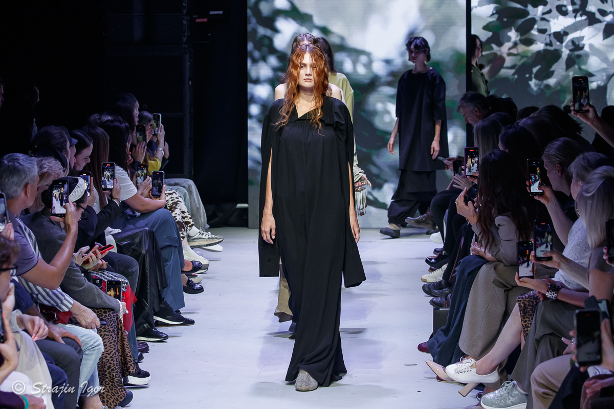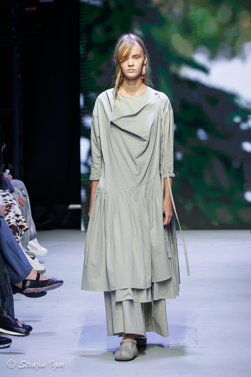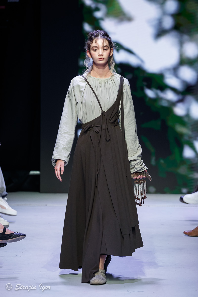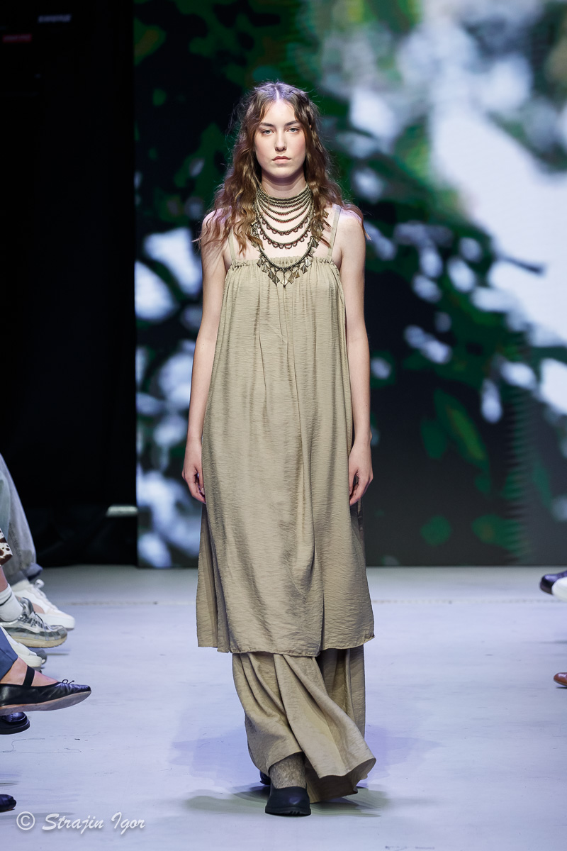 Основу линейки составили свободные платья макси, сарафаны, туники на запах и с асимметричными завязками, надетые поверх юбок. Силуэты преимущественно свободные, с акцентом на воздушность. В коллекции использовались легкие и плотные ткани с различными текстурами. Цветовая гамма строилась на нейтральных и пастельных тонах: чёрном, белом, бежевом и коричневом. Принты дополнили образы.