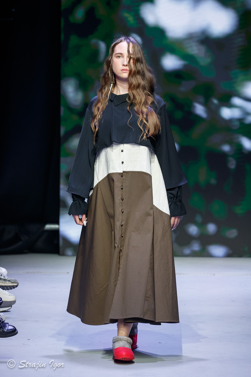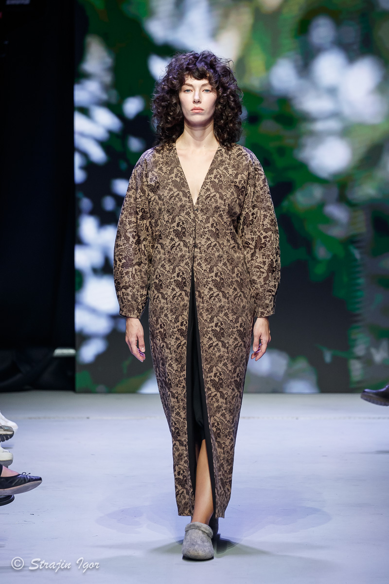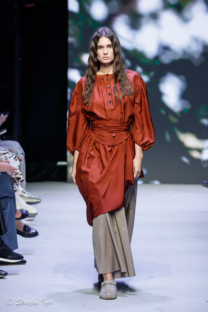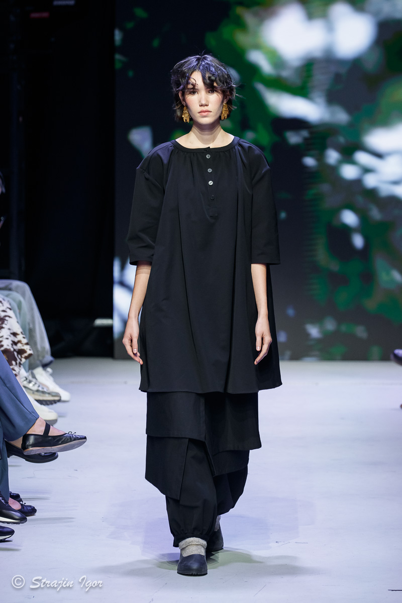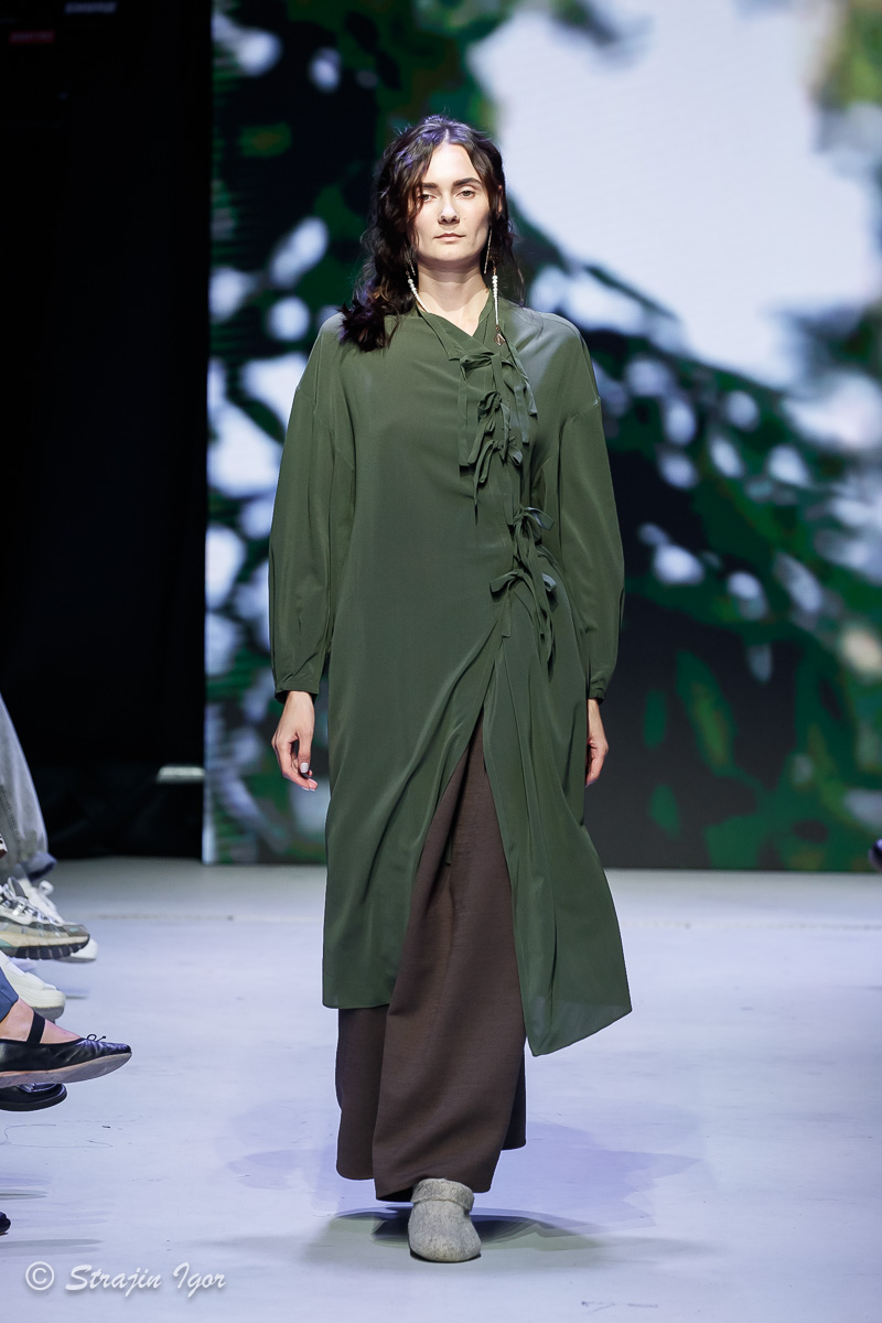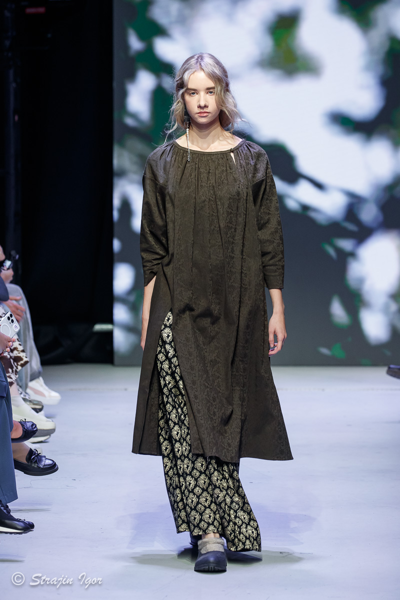 Основу линейки составили свободные платья макси, сарафаны, туники на запах и с асимметричными завязками, надетые поверх юбок. Силуэты преимущественно свободные, с акцентом на воздушность. В коллекции использовались легкие и плотные ткани с различными текстурами. Цветовая гамма строилась на нейтральных и пастельных тонах: чёрном, белом, бежевом и коричневом. Принты дополнили образы.