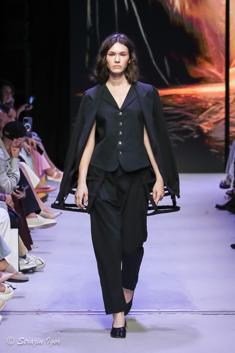 Бренд представил коллекцию, в основе которой — архитектурный крой и игра со структурными элементами изделий. Образы выполнены с намеренным эффектом незавершенности: вскрытые швы, асимметричные формы и силуэты, напоминающие театральные костюмы с «изнанкой наружу».