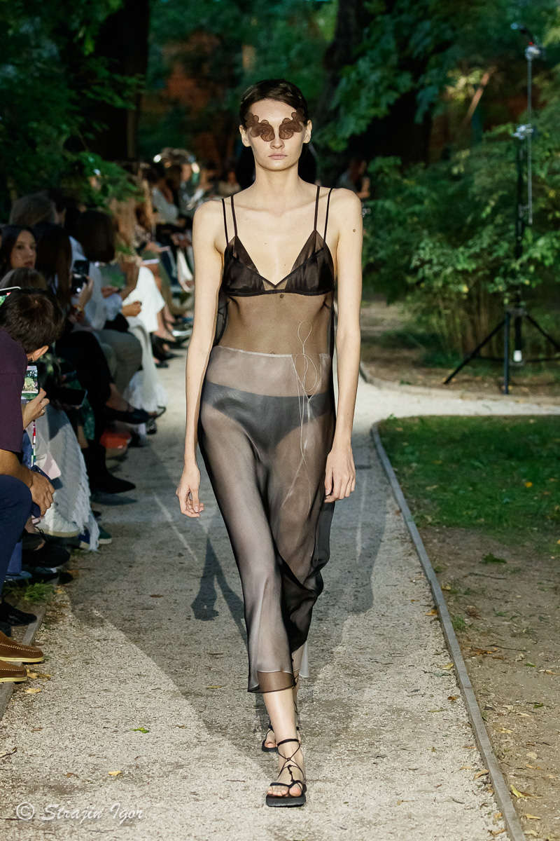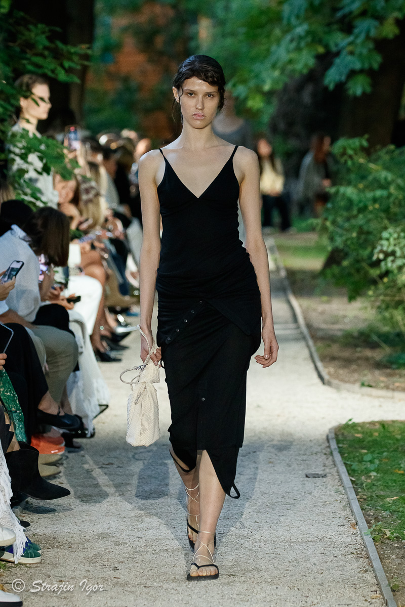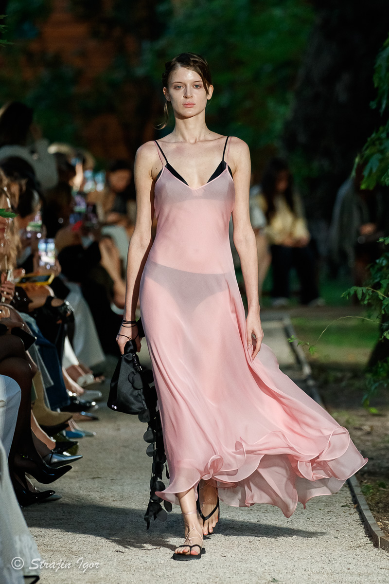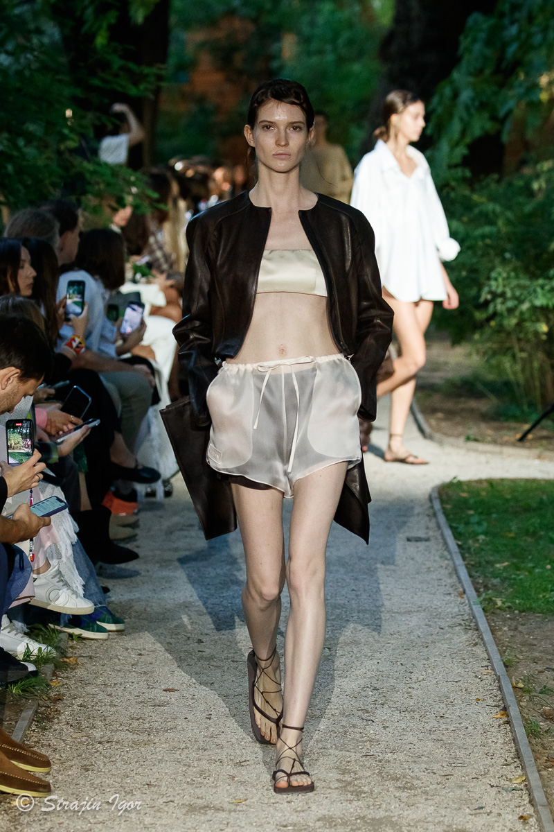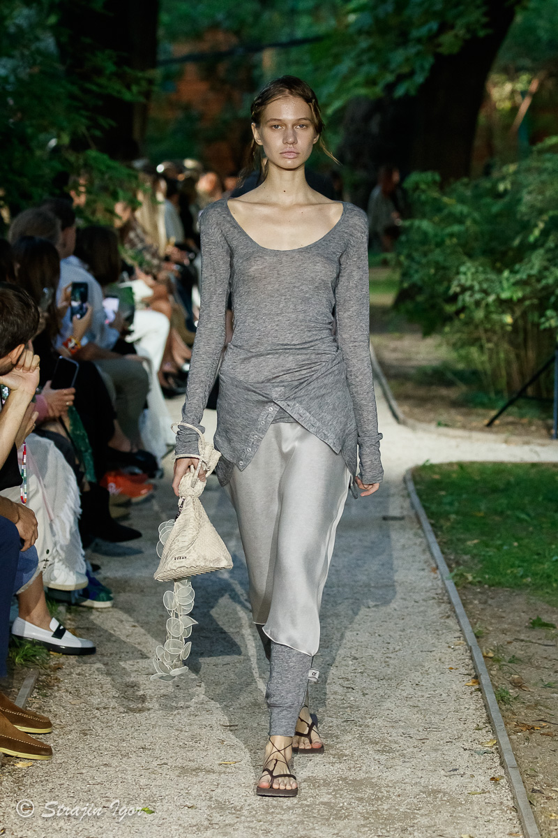 Бренд представил коллекцию, выполненную преимущественно в нежных и теплых оттенках, — игра контрастов, построенная на сочетании прозрачных воздушных тканей, тонкого трикотажа и плотных фактур. Особое место в линейке заняли многочисленные узлы, использованные не только в конструкции изделий, но и в прическах моделей, а также цветочные юбки-медузы и неожиданные акценты в виде вьетнамок.