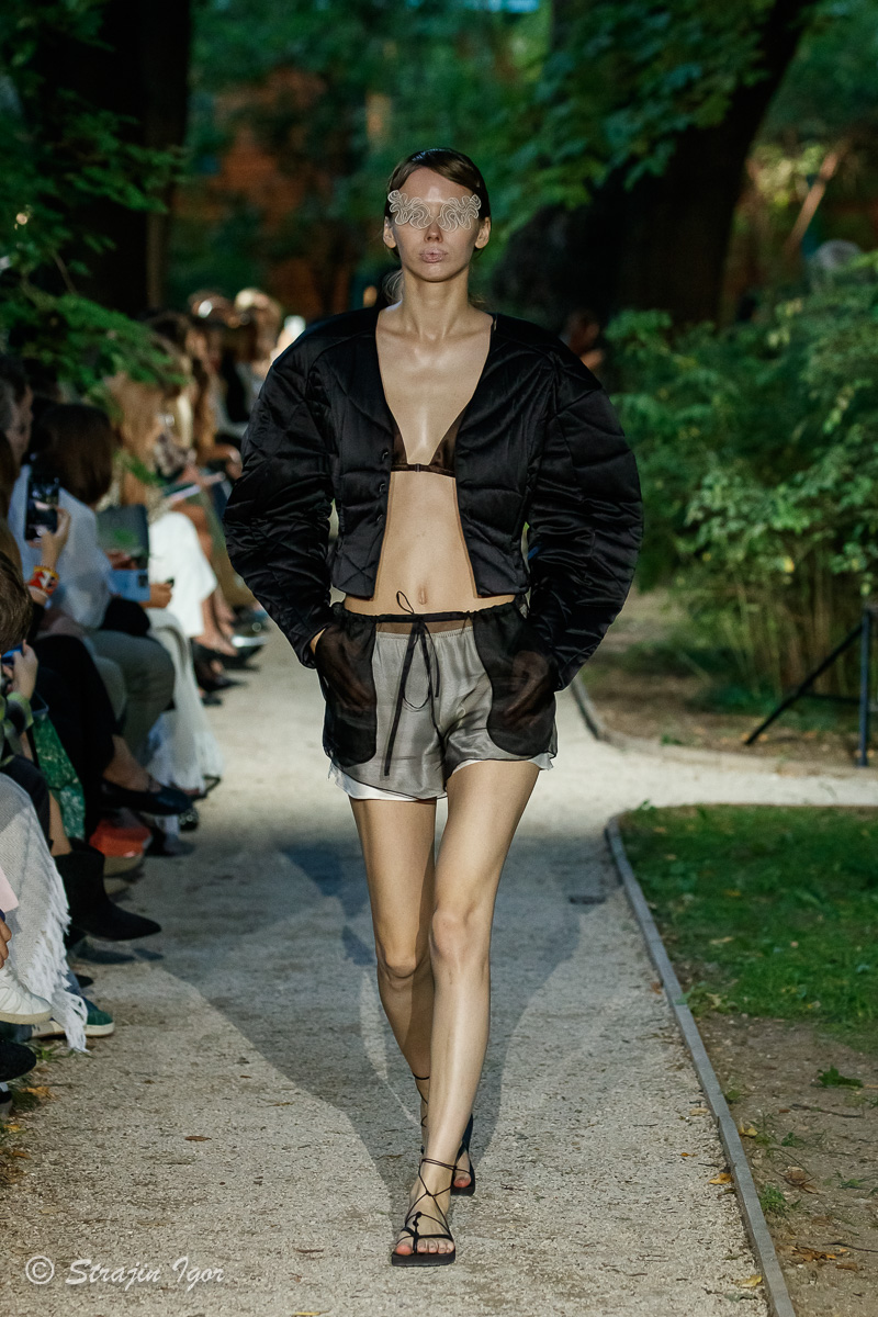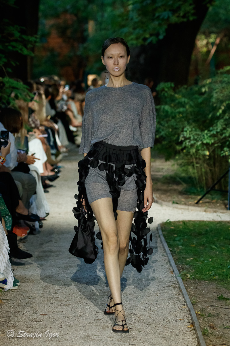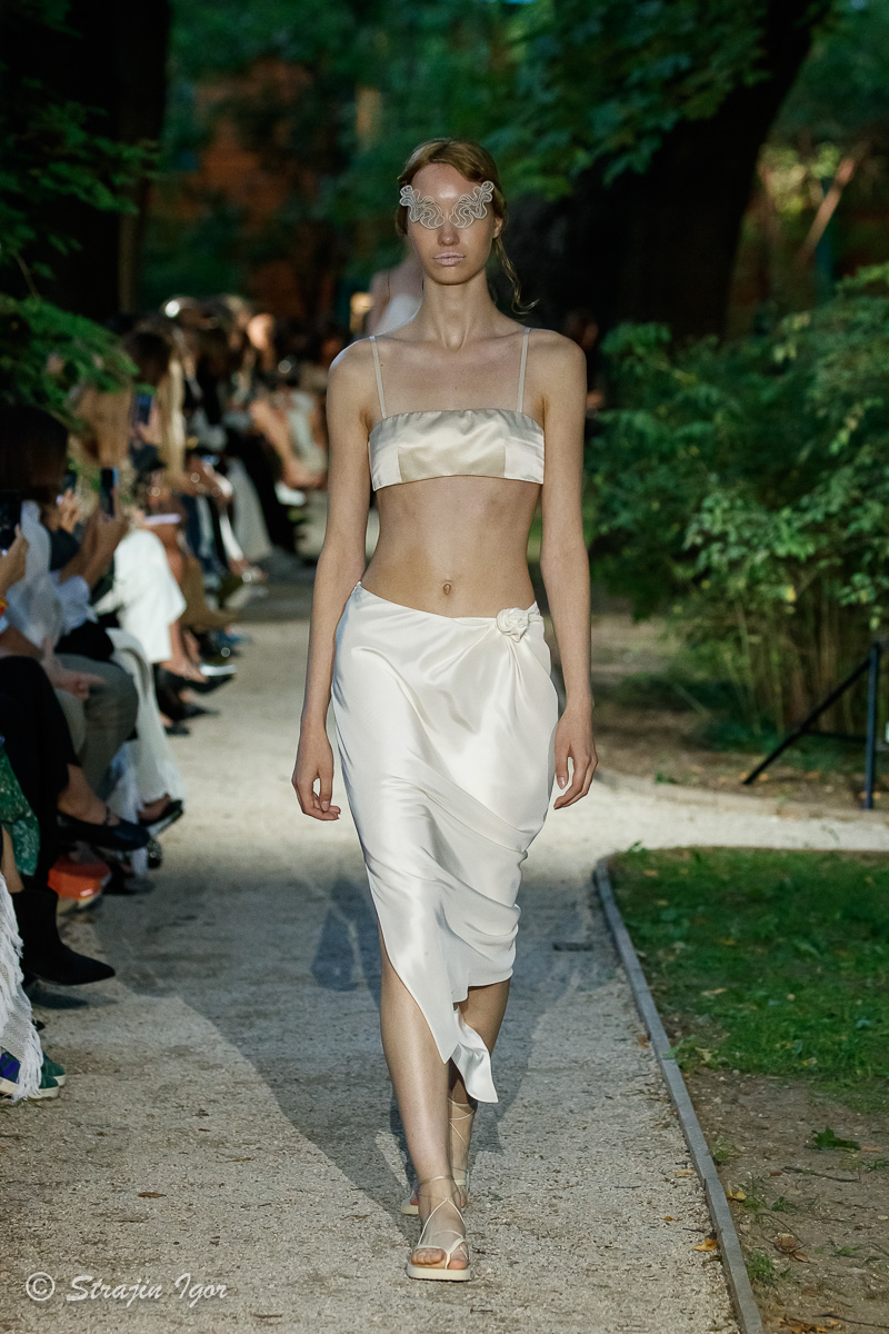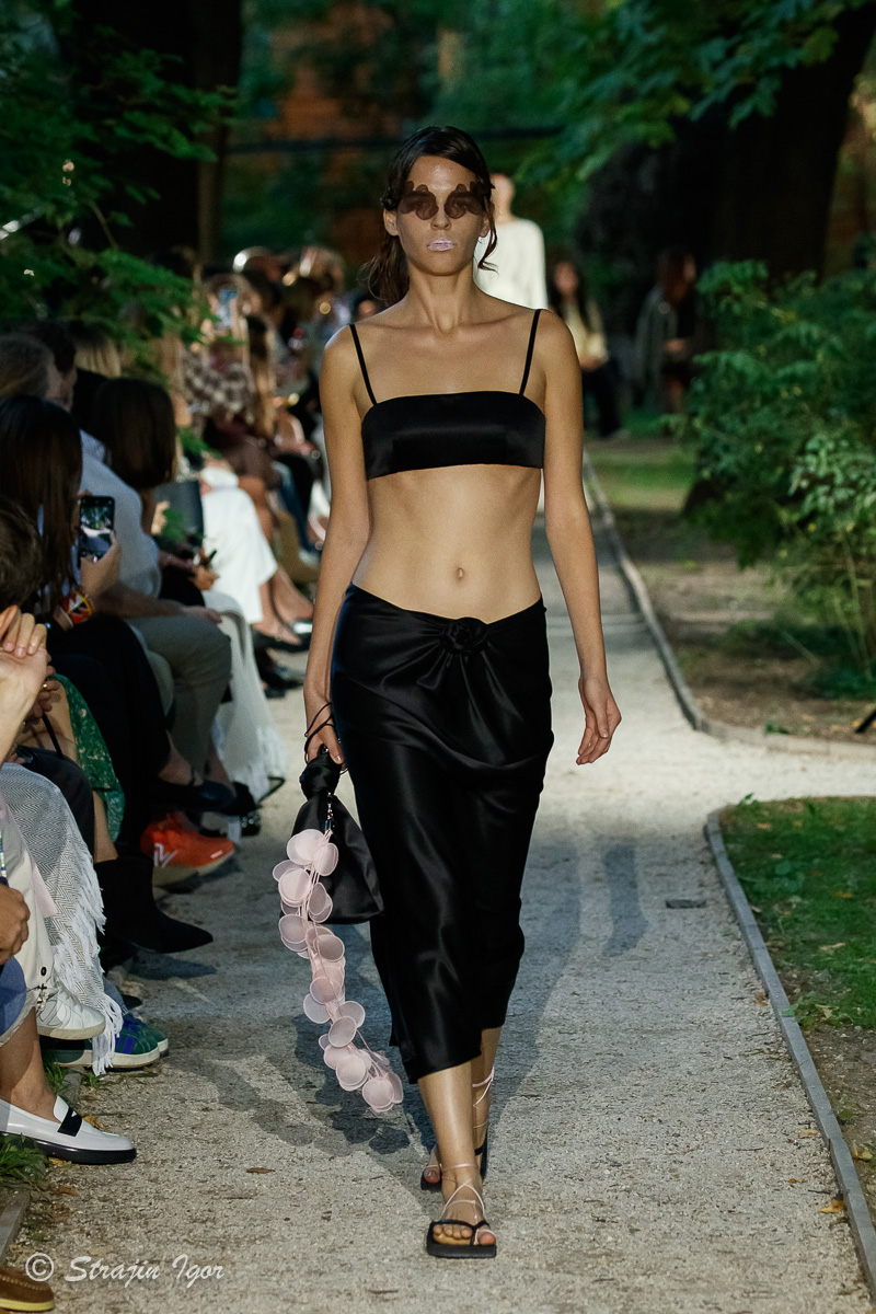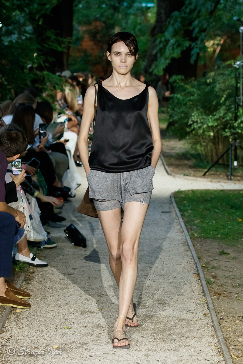 Бренд представил коллекцию, выполненную преимущественно в нежных и теплых оттенках, — игра контрастов, построенная на сочетании прозрачных воздушных тканей, тонкого трикотажа и плотных фактур. Особое место в линейке заняли многочисленные узлы, использованные не только в конструкции изделий, но и в прическах моделей, а также цветочные юбки-медузы и неожиданные акценты в виде вьетнамок.