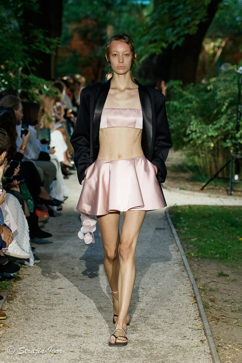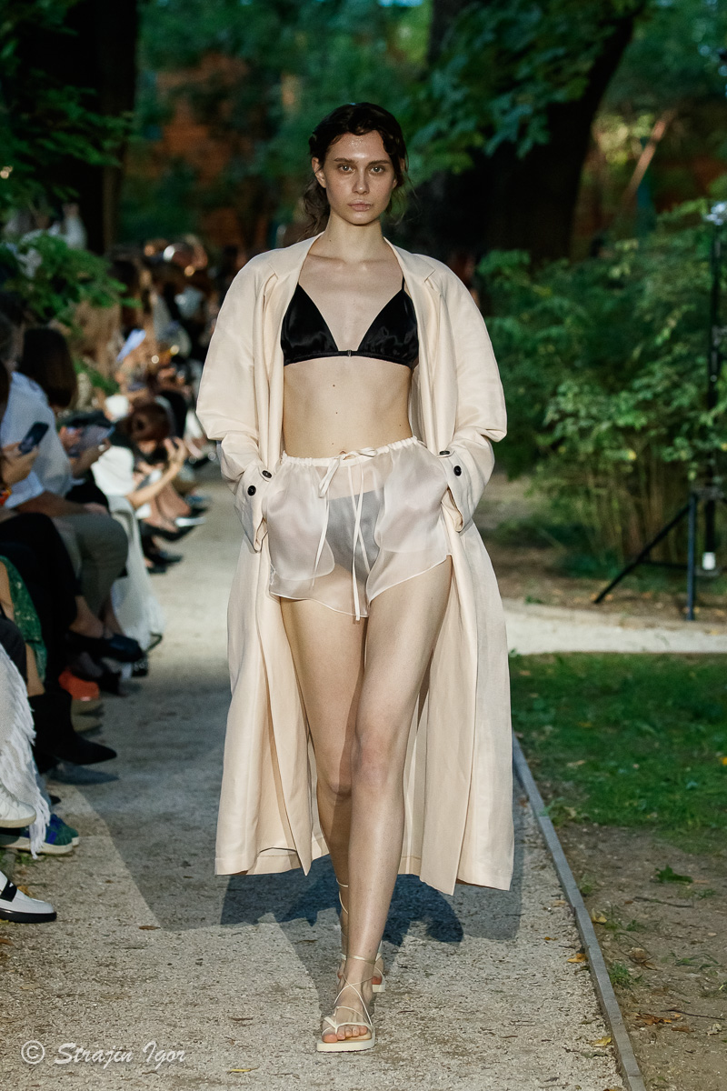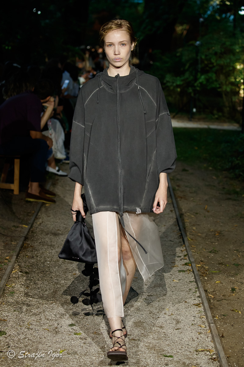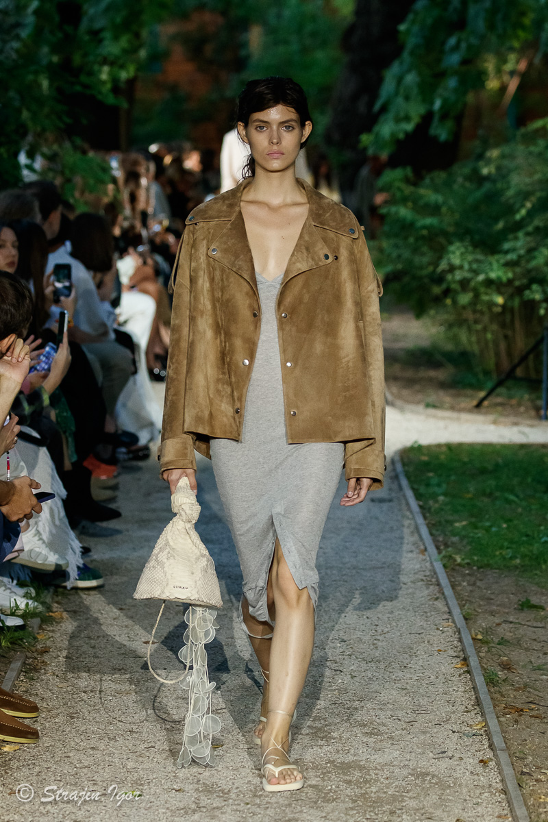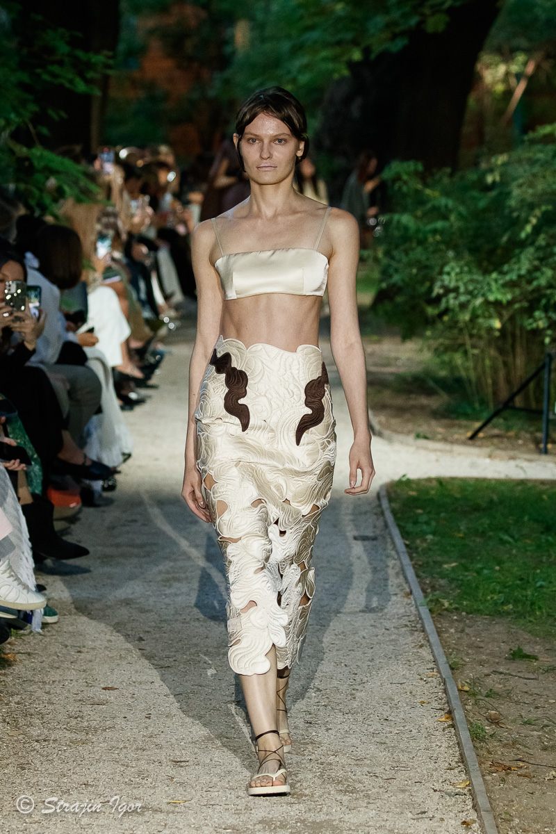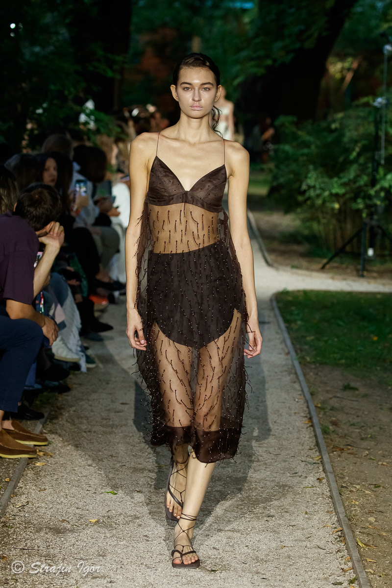 Бренд представил коллекцию, выполненную преимущественно в нежных и теплых оттенках, — игра контрастов, построенная на сочетании прозрачных воздушных тканей, тонкого трикотажа и плотных фактур. Особое место в линейке заняли многочисленные узлы, использованные не только в конструкции изделий, но и в прическах моделей, а также цветочные юбки-медузы и неожиданные акценты в виде вьетнамок.