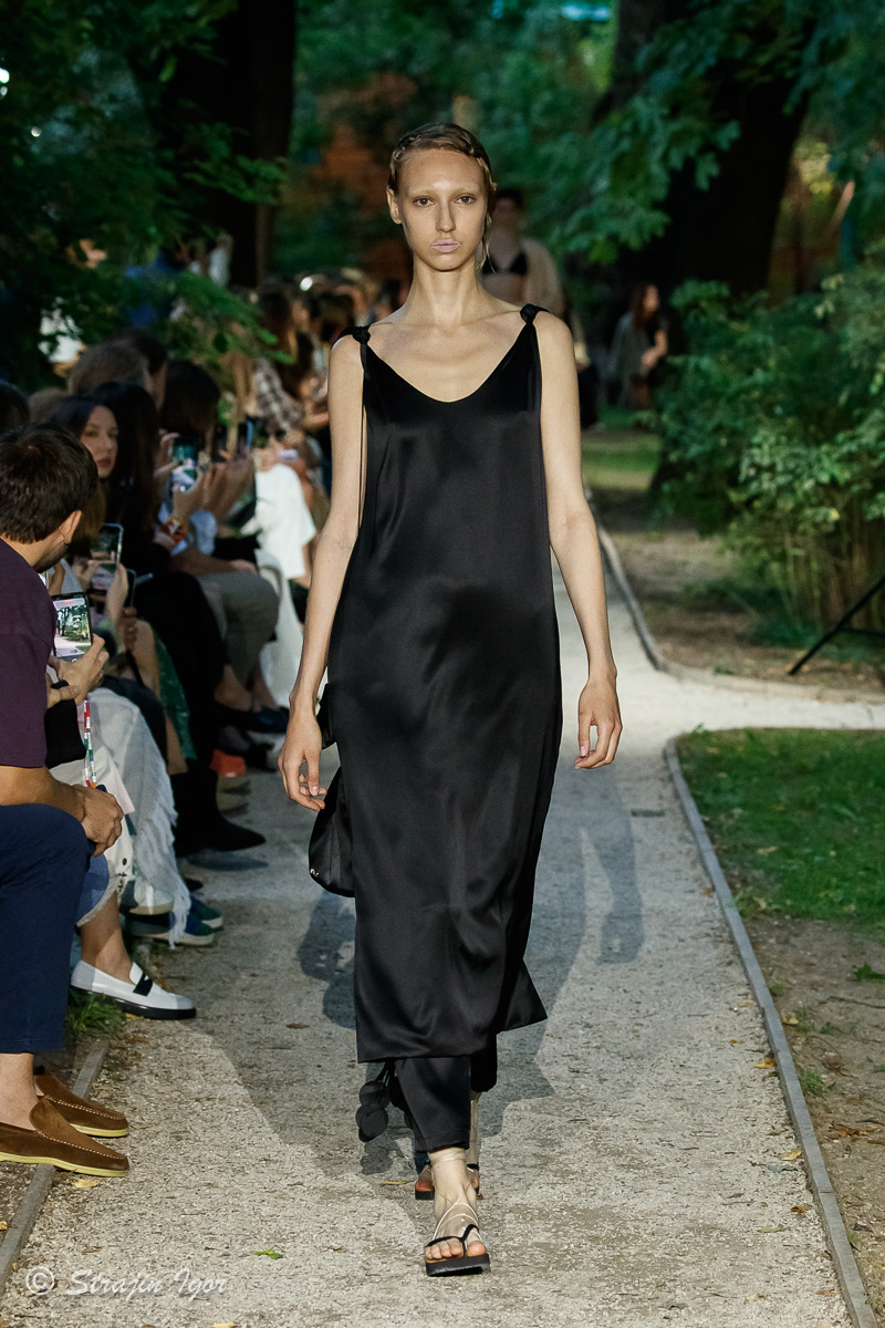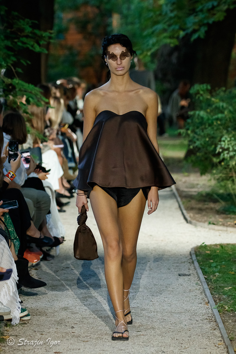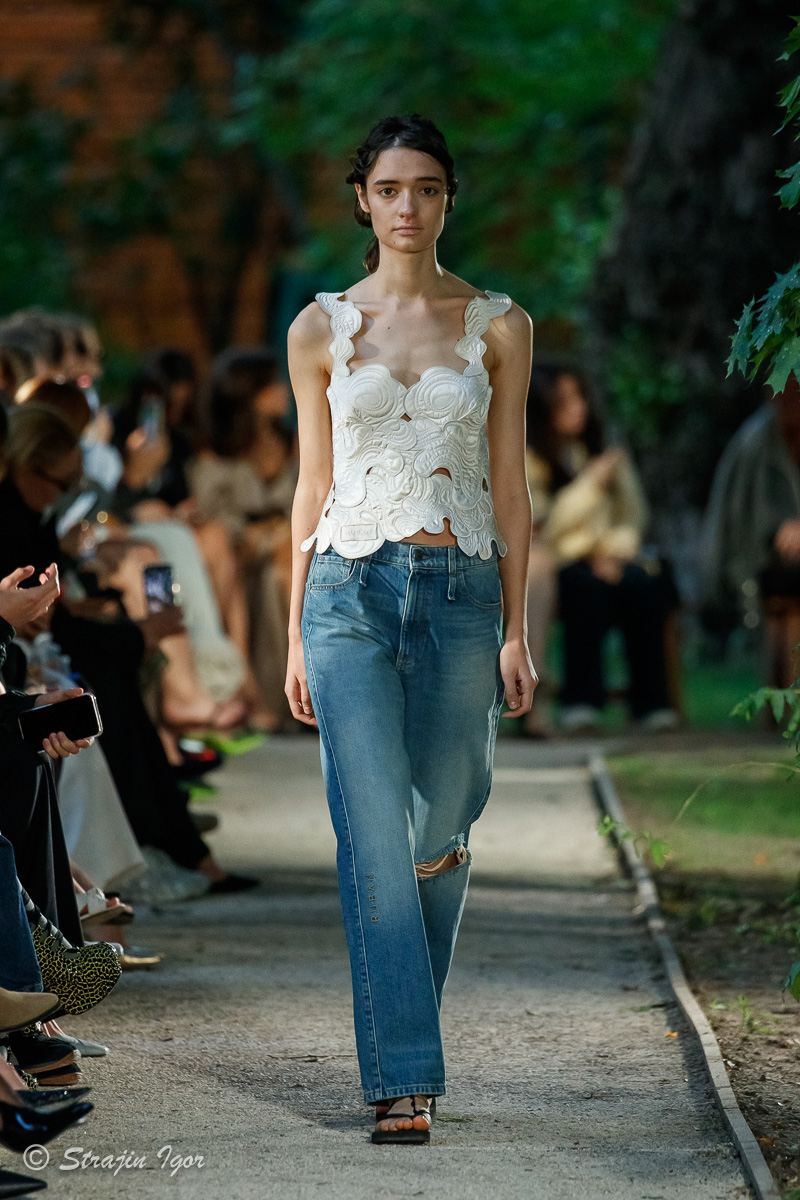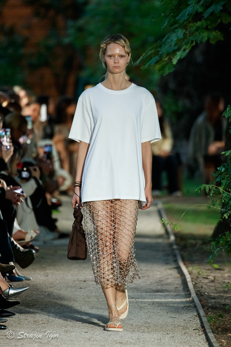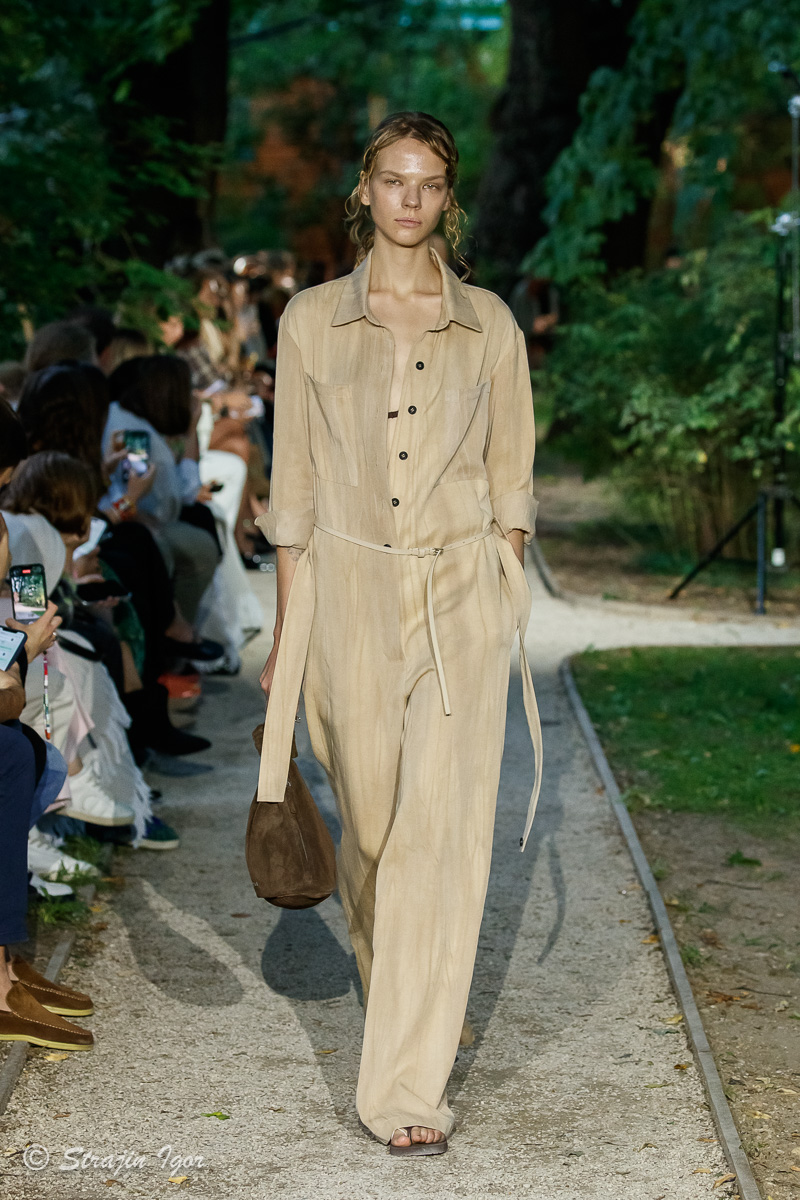 Бренд представил коллекцию, выполненную преимущественно в нежных и теплых оттенках, — игра контрастов, построенная на сочетании прозрачных воздушных тканей, тонкого трикотажа и плотных фактур. Особое место в линейке заняли многочисленные узлы, использованные не только в конструкции изделий, но и в прическах моделей, а также цветочные юбки-медузы и неожиданные акценты в виде вьетнамок.