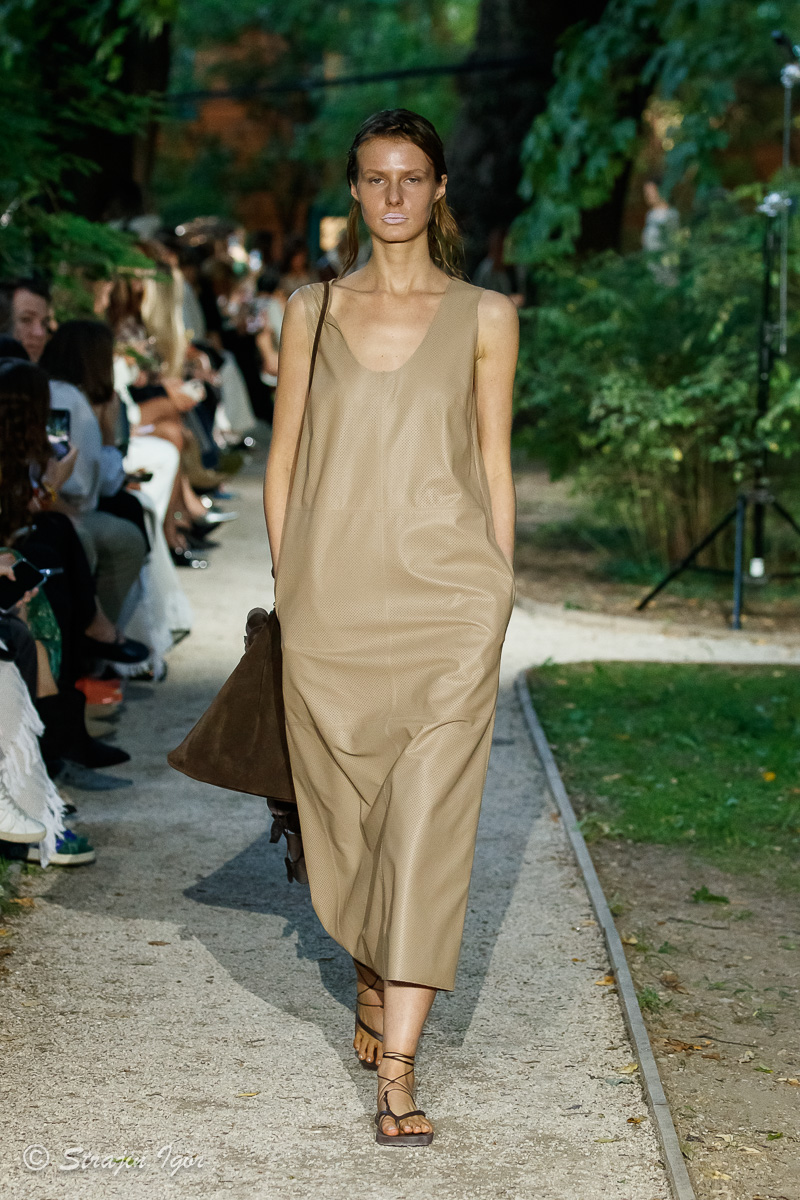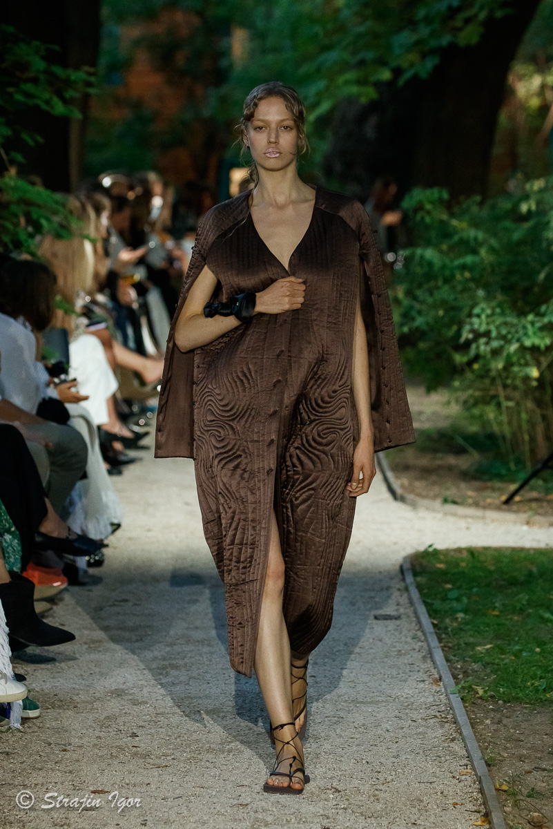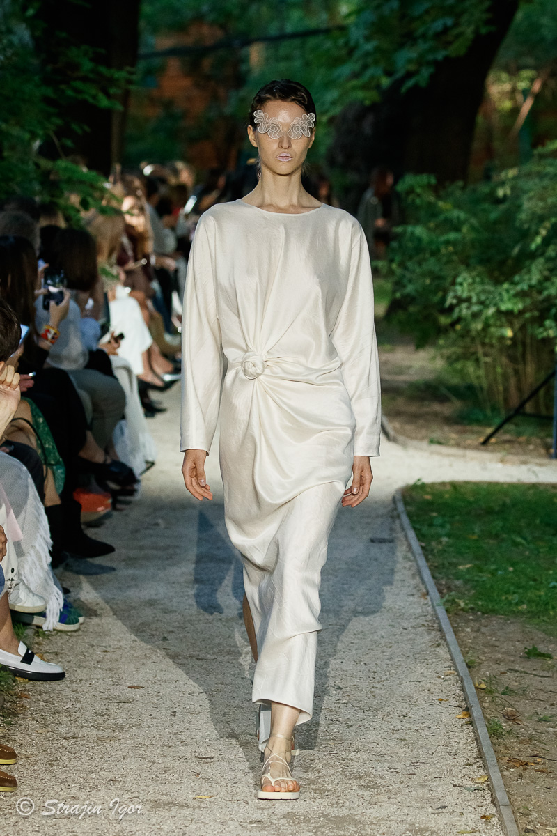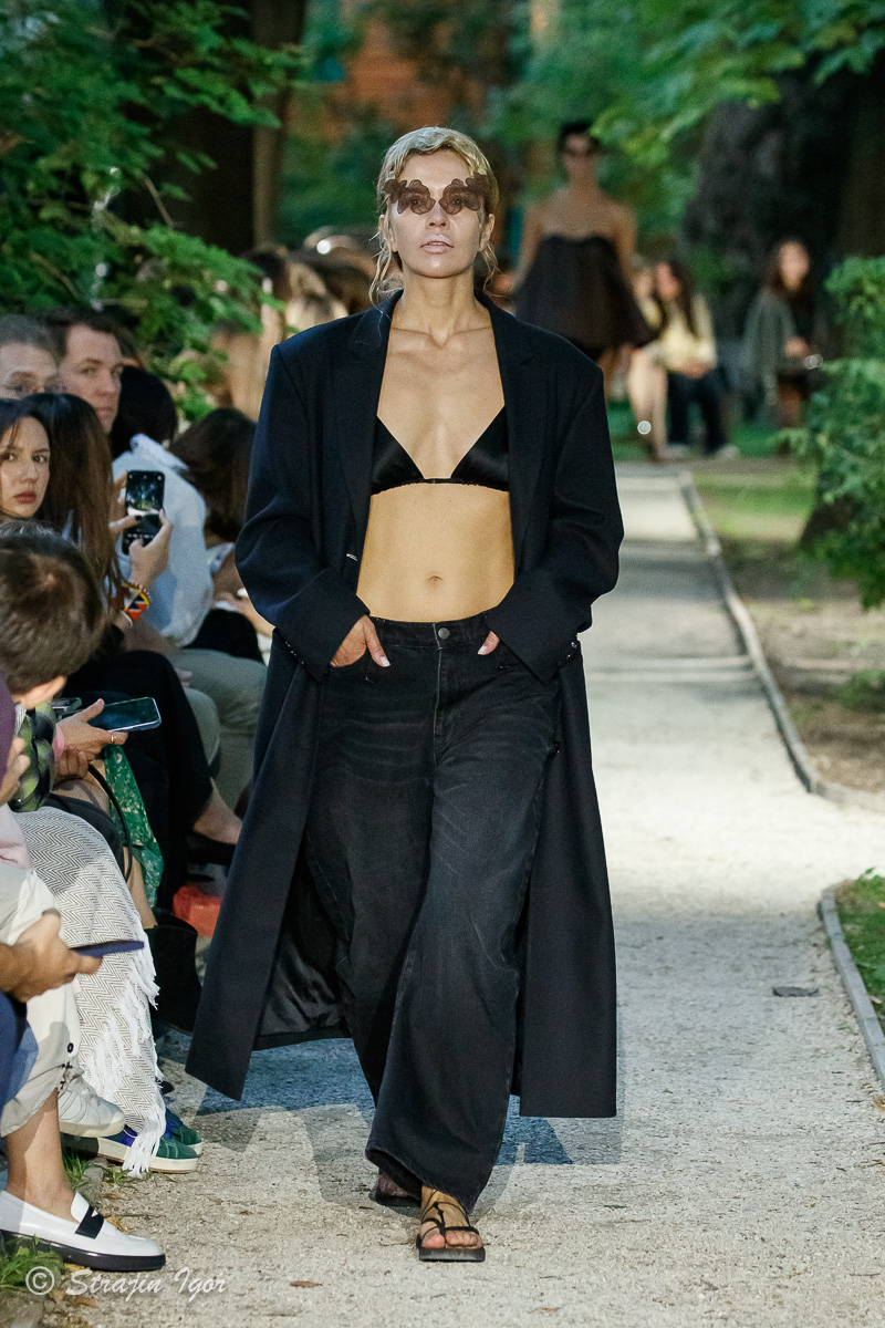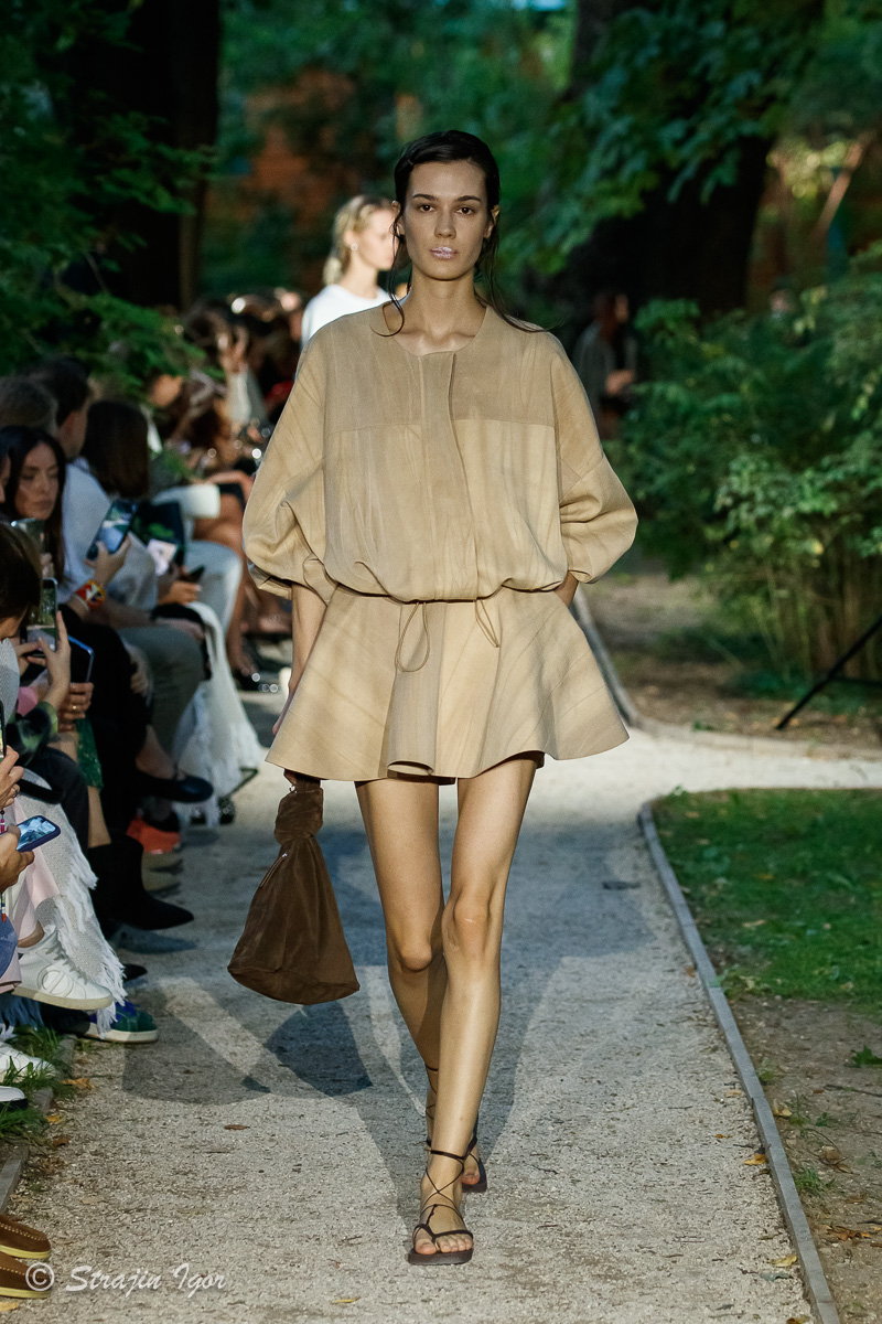 Концепцию коллекции подчеркнули саундтрек пения птиц и сама локация — Музея-усадьбы Л. Н. Толстого, который стал не просто фоном, а значимым дополнением. Аллеи гравийных дорожек превратились в подиум, а вековые деревья и цветочные насаждения — естественной декорацией.