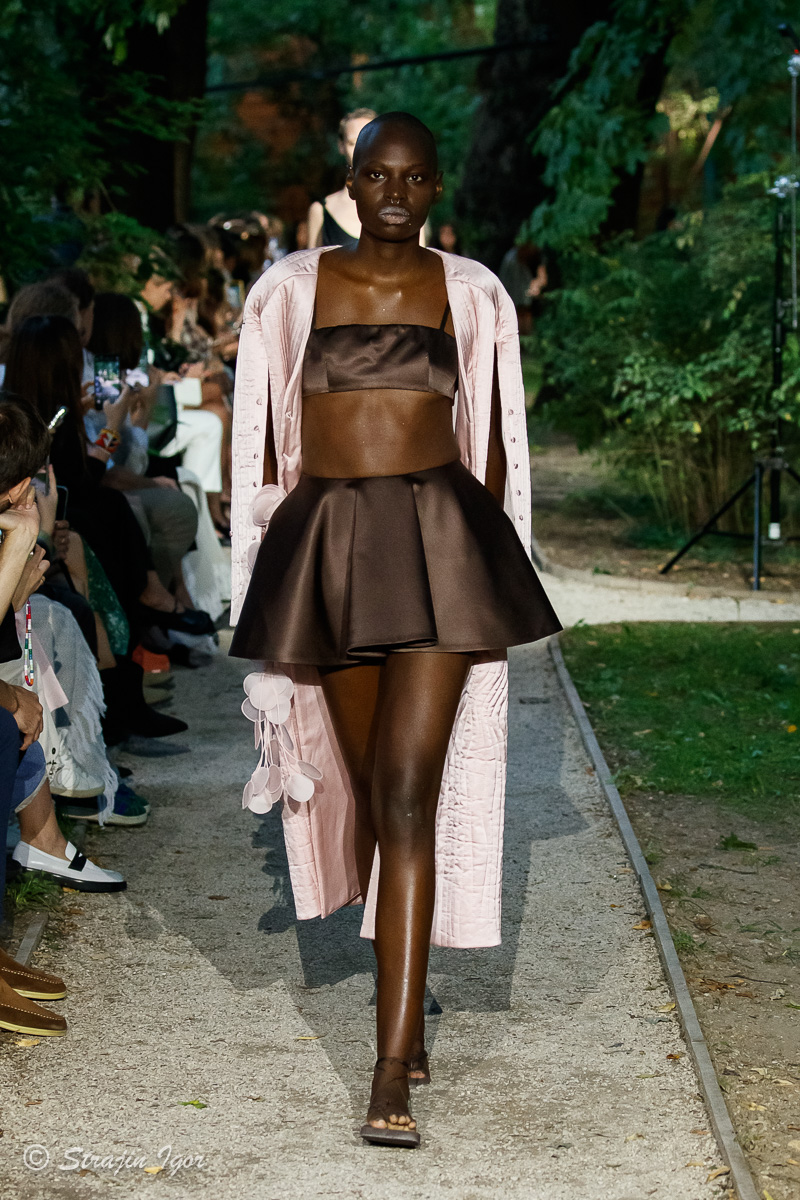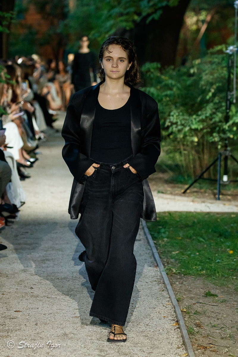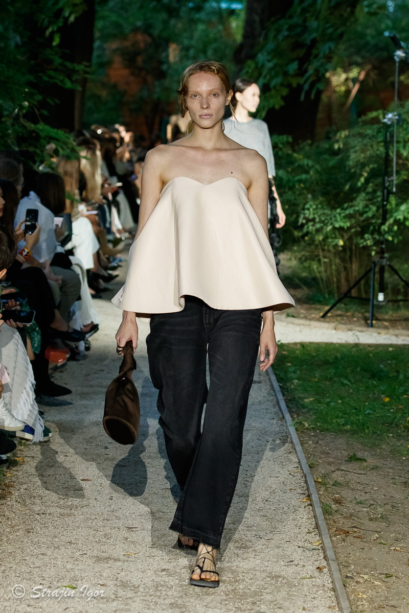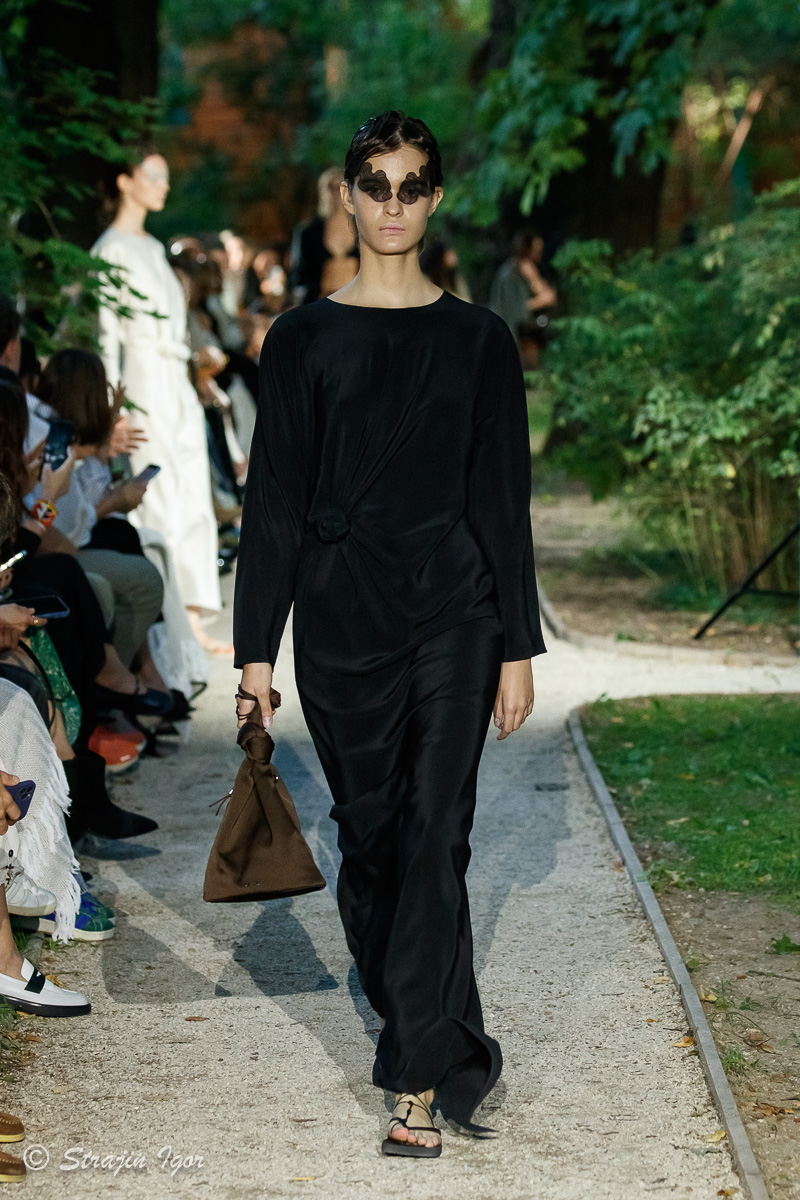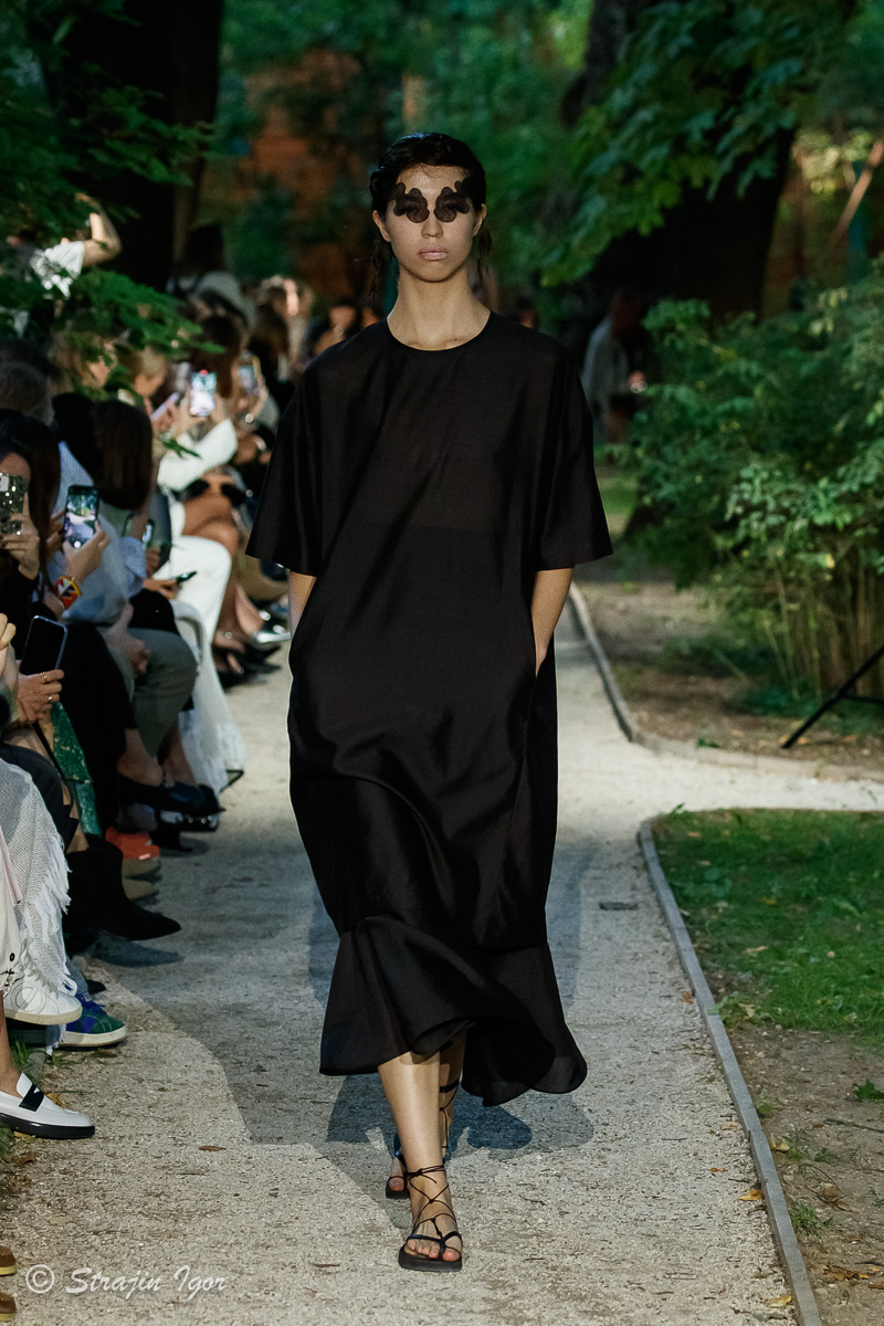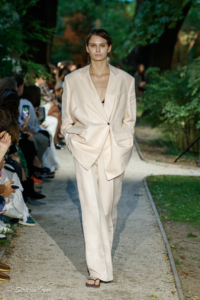 Концепцию коллекции подчеркнули саундтрек пения птиц и сама локация — Музея-усадьбы Л. Н. Толстого, который стал не просто фоном, а значимым дополнением. Аллеи гравийных дорожек превратились в подиум, а вековые деревья и цветочные насаждения — естественной декорацией.