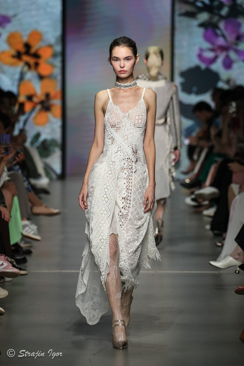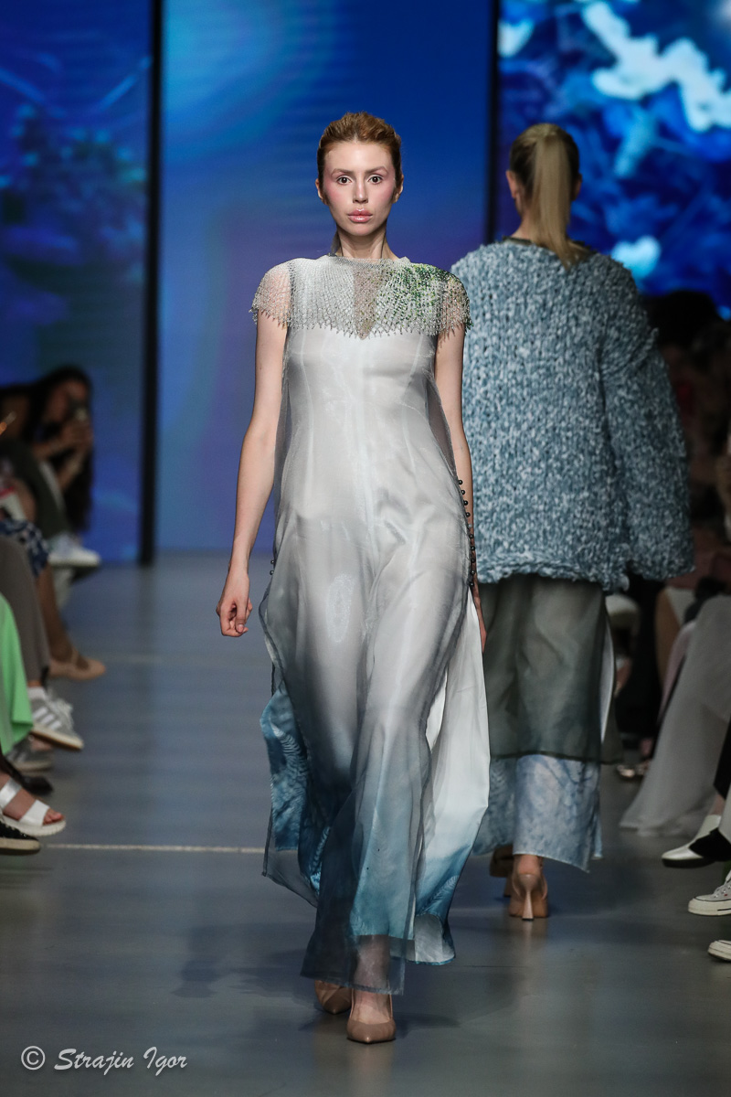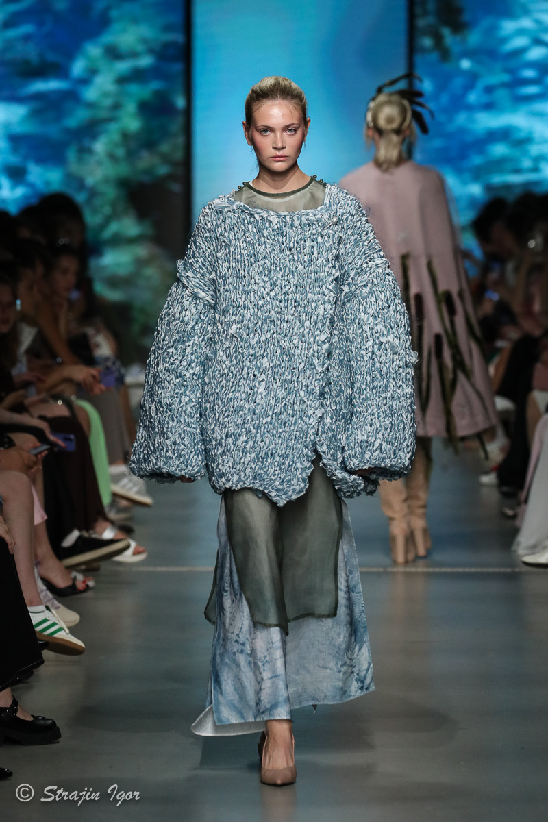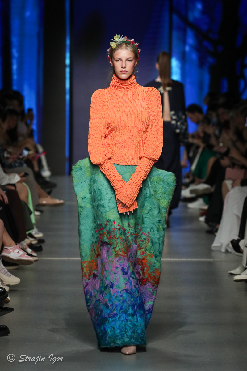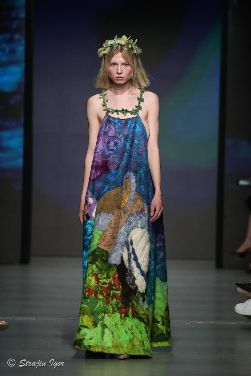 На подиуме было представлено более 40 образов, созданных с использованием разнообразных, в том числе ручных, техник: моделирование и вышивка, коллажирование и создание принта, папье‑маше, скульптурирование и 3D‑принтинг, аппликативные техники и валяние, все виды вязания и плетения кружева, макраме и intrecciato, пэчворк и работа с кожей, а также исторические и современные корсетные технологии.