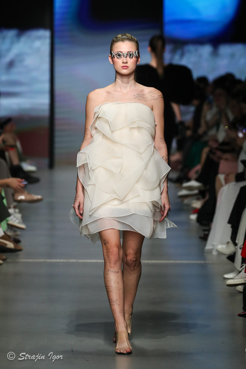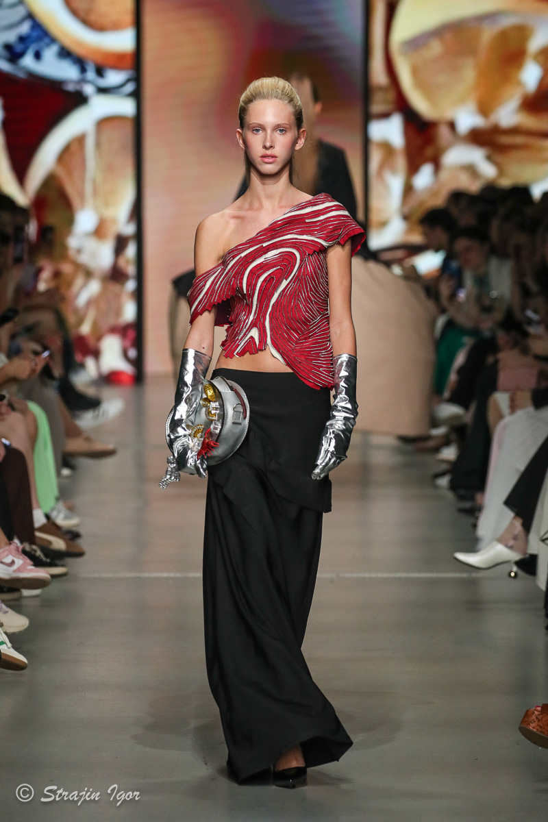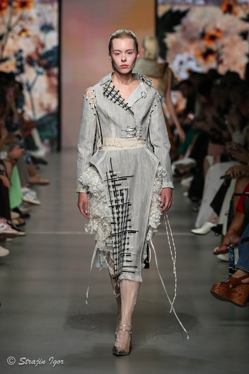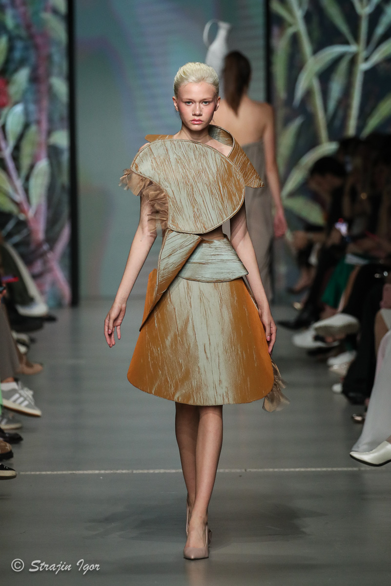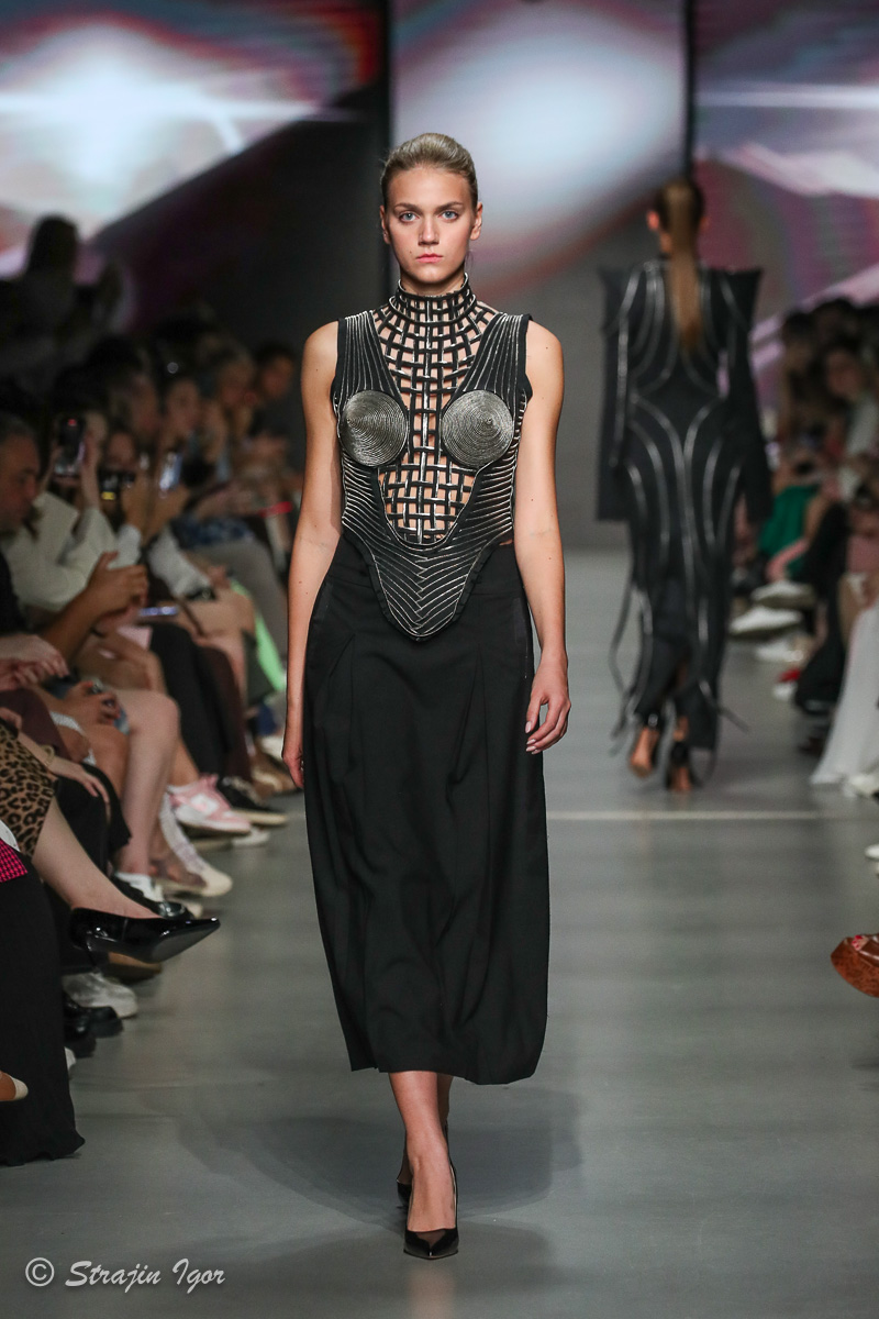 На подиуме было представлено более 40 образов, созданных с использованием разнообразных, в том числе ручных, техник: моделирование и вышивка, коллажирование и создание принта, папье‑маше, скульптурирование и 3D‑принтинг, аппликативные техники и валяние, все виды вязания и плетения кружева, макраме и intrecciato, пэчворк и работа с кожей, а также исторические и современные корсетные технологии.