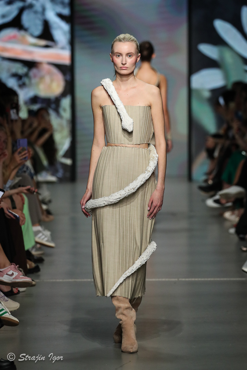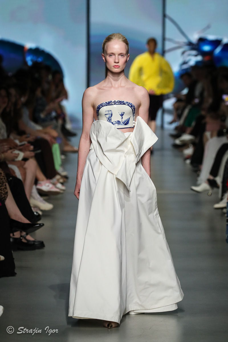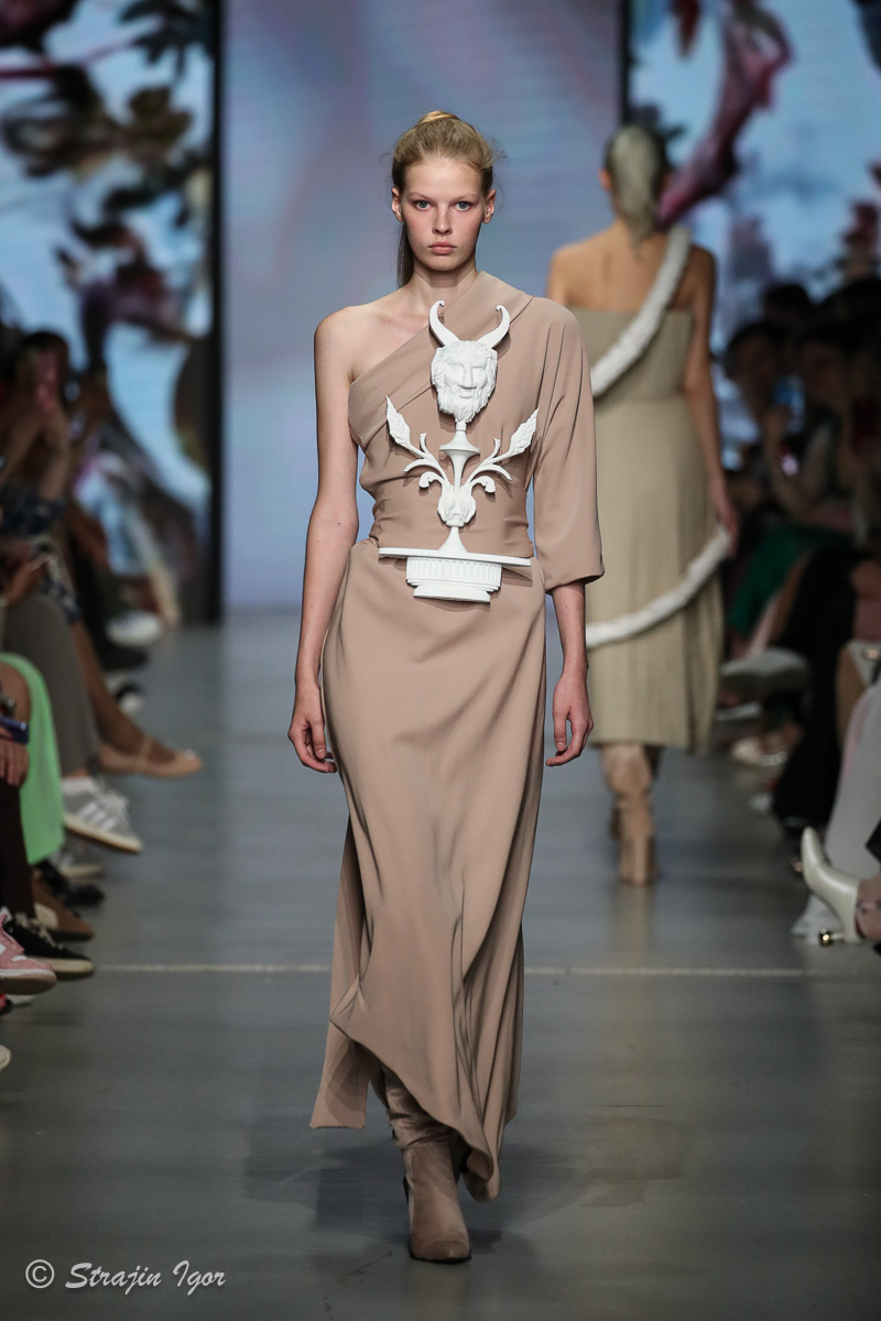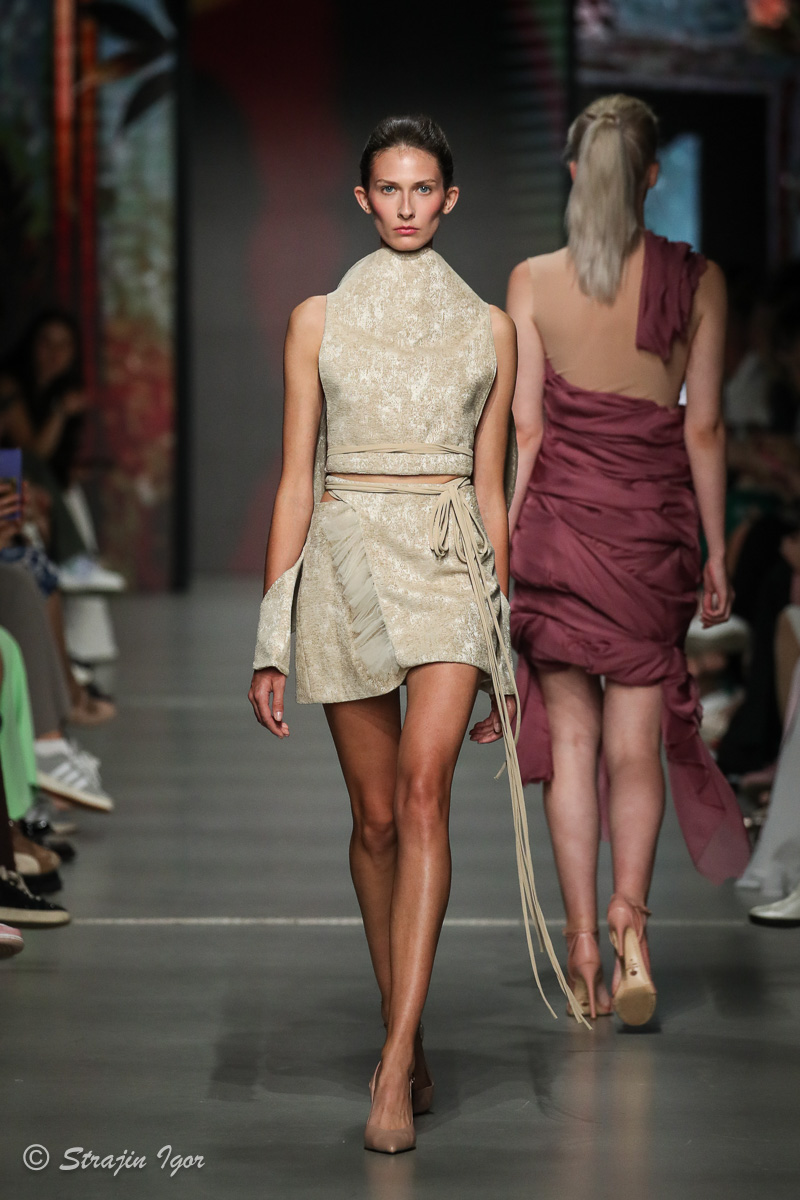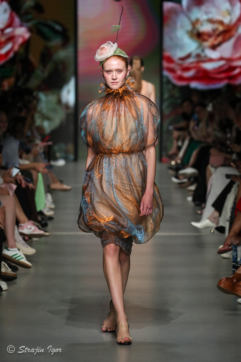 На подиуме было представлено более 40 образов, созданных с использованием разнообразных, в том числе ручных, техник: моделирование и вышивка, коллажирование и создание принта, папье‑маше, скульптурирование и 3D‑принтинг, аппликативные техники и валяние, все виды вязания и плетения кружева, макраме и intrecciato, пэчворк и работа с кожей, а также исторические и современные корсетные технологии.