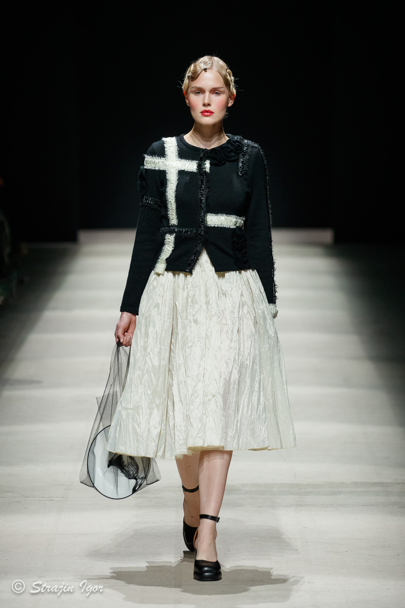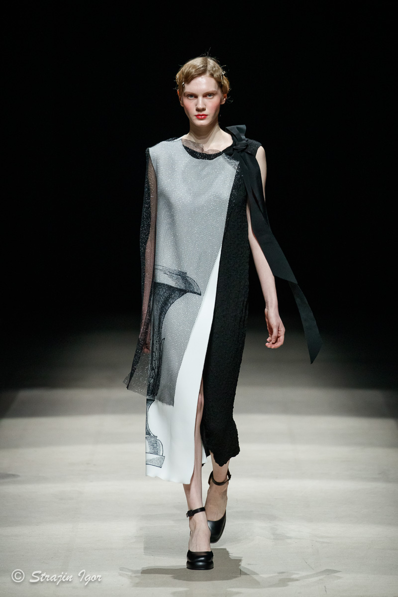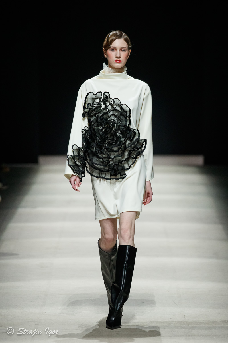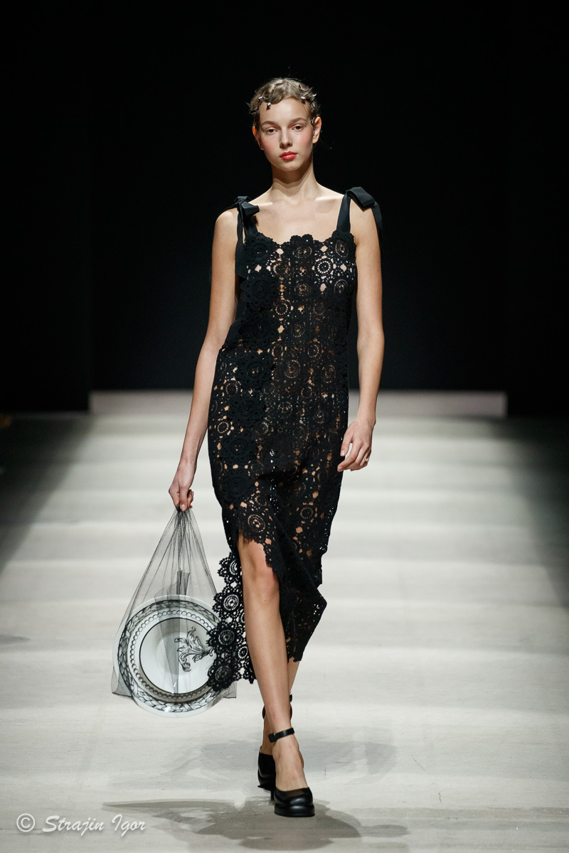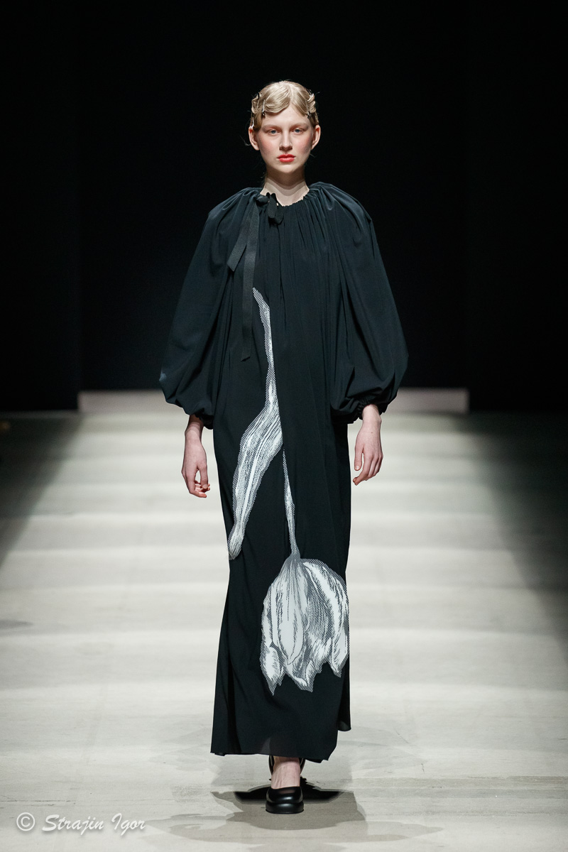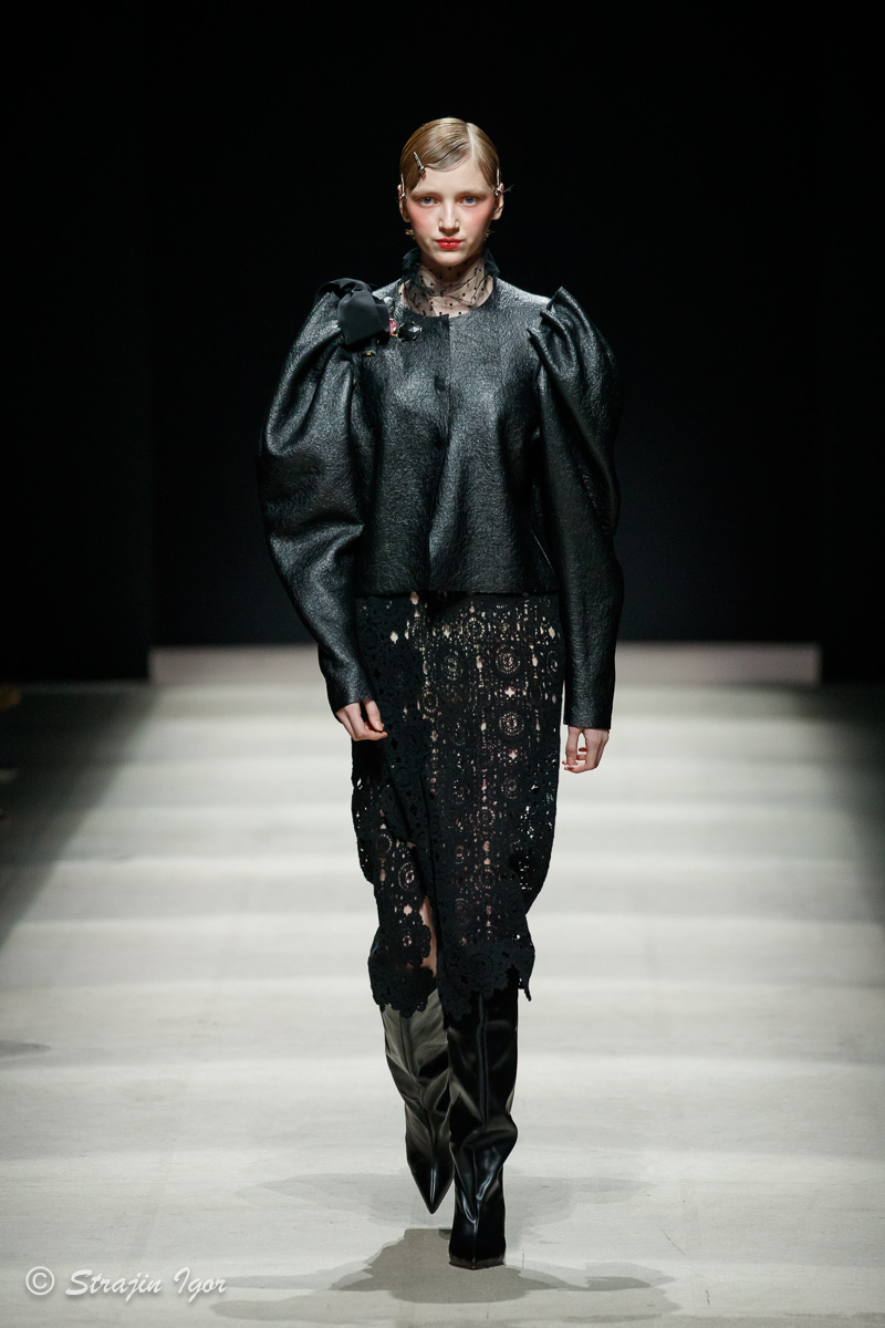 На подиуме в ЦВЗ «Манеж» — будто ожившие страницы прошлого: чёрно-белая палитра, закрытые силуэты, струящийся шёлк, архитектурное кружево, фактуры, в которых читаются фасады старинного имения и даже дикие розы.