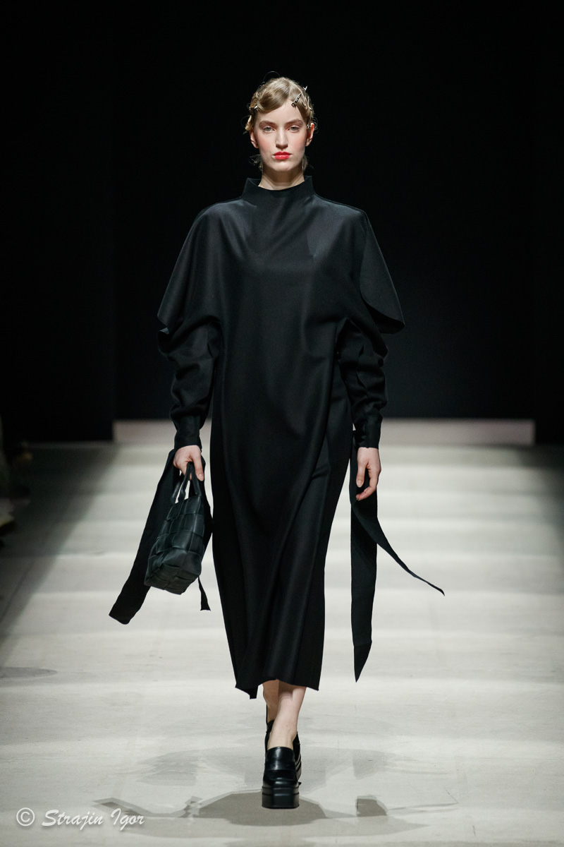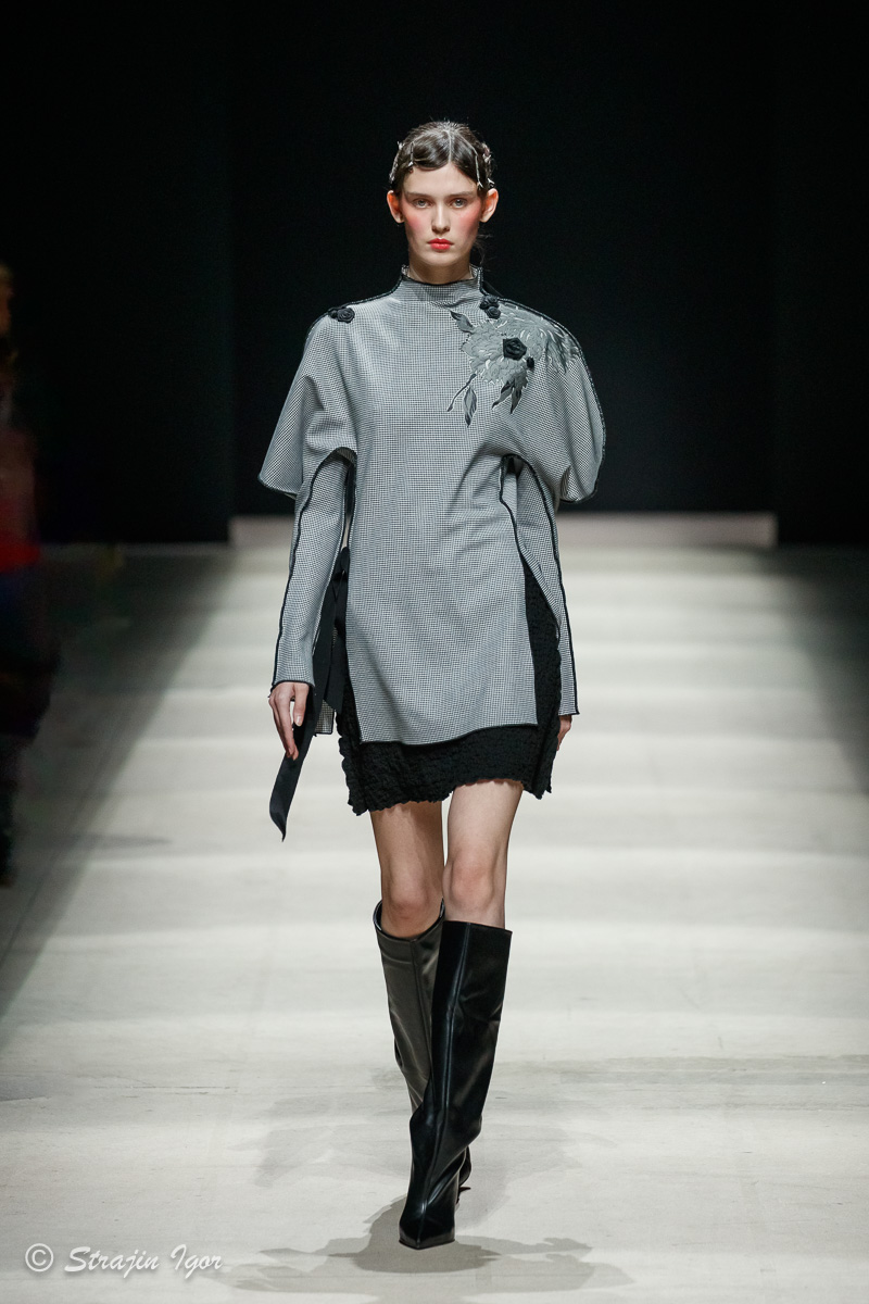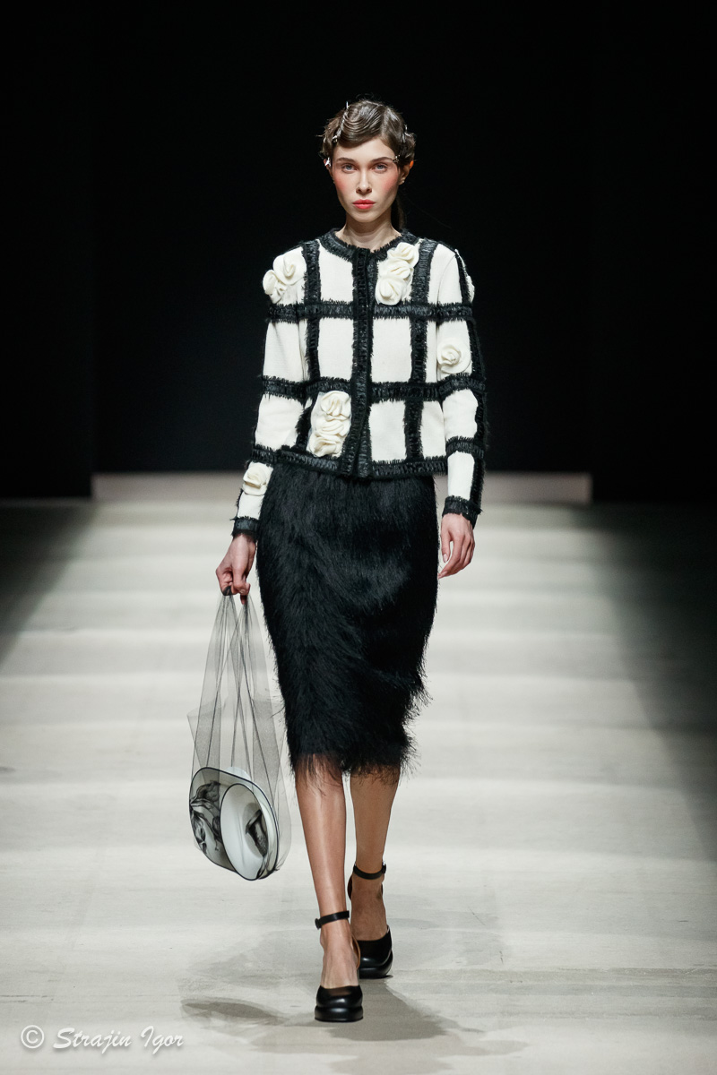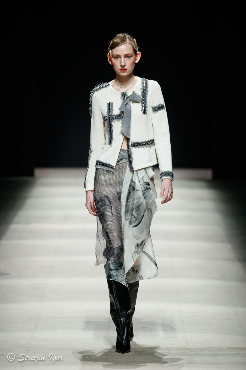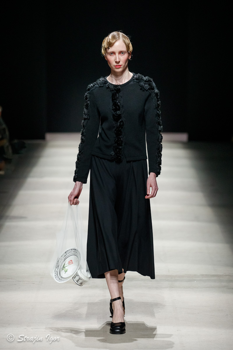 На подиуме в ЦВЗ «Манеж» — будто ожившие страницы прошлого: чёрно-белая палитра, закрытые силуэты, струящийся шёлк, архитектурное кружево, фактуры, в которых читаются фасады старинного имения и даже дикие розы.