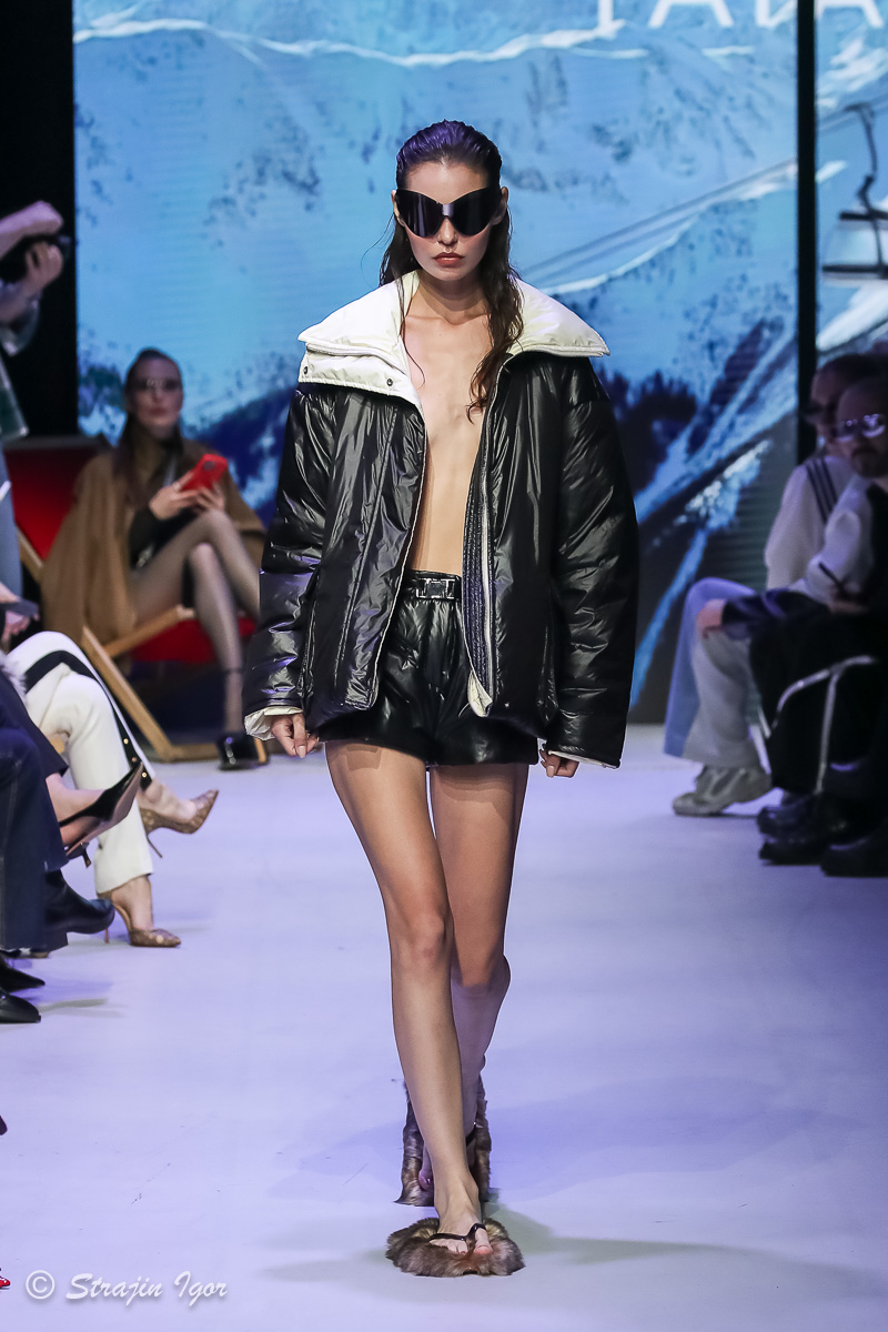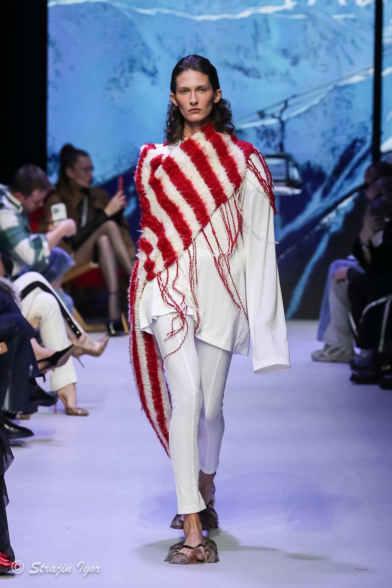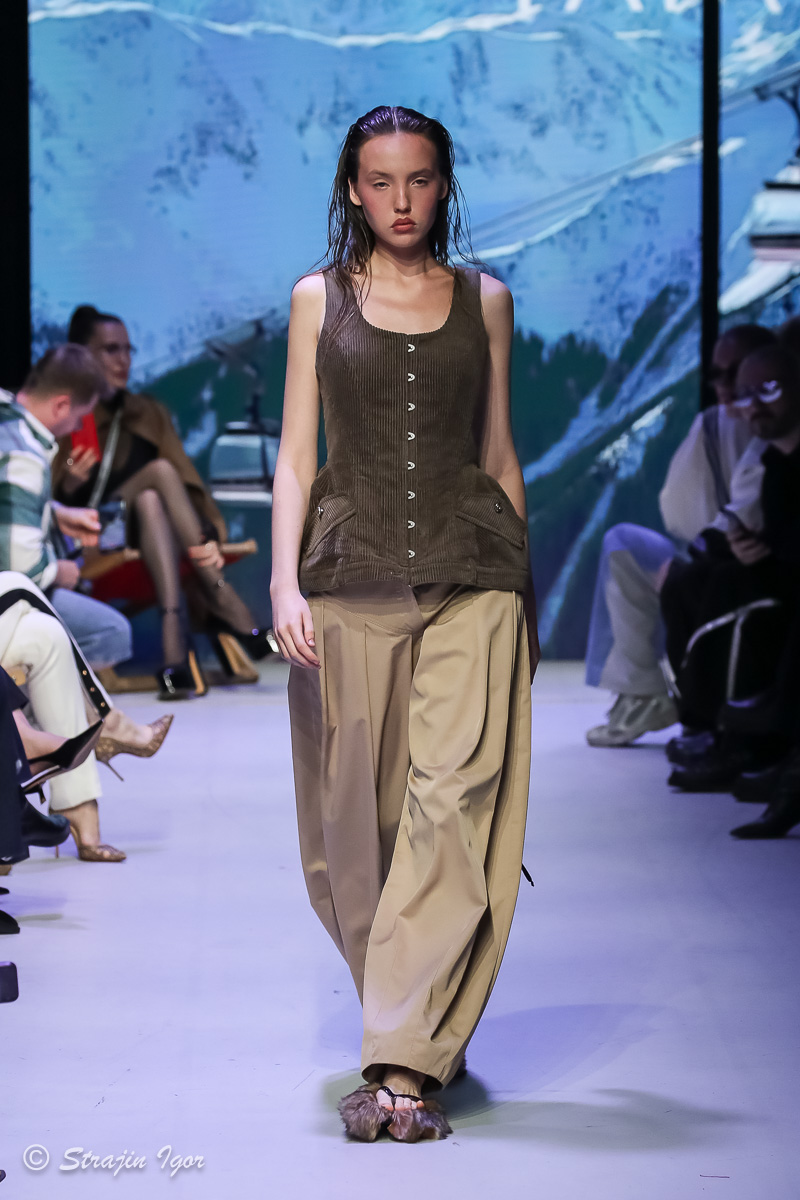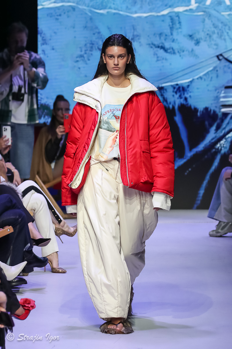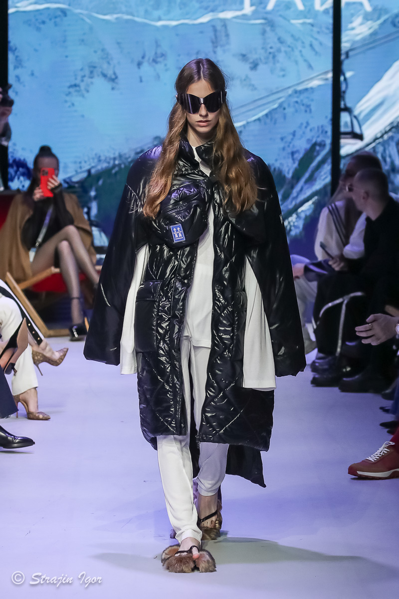 В линейке были показаны комплекты из зимних курток и шорт, утепленные корсеты, трендовые брюки-алладины из непромокаемой ткани и деловые костюмы с вышивкой. Акцентами стали пушистые изделия с яркими принтами, минималистичные надписи, вышивка в виде Альпийских гор и ультрадлинные рукава.
