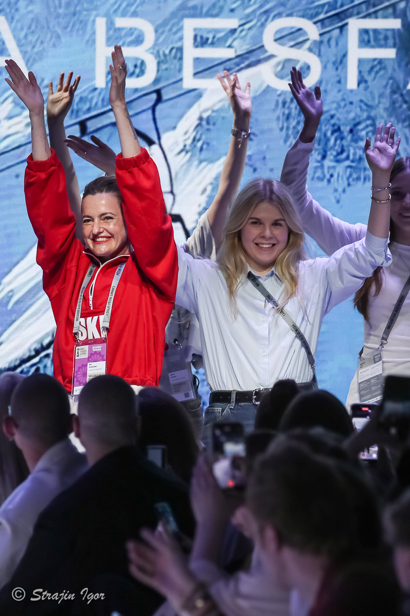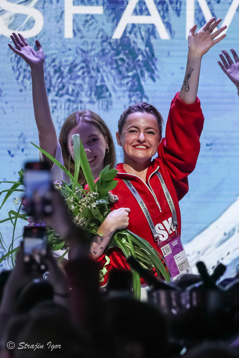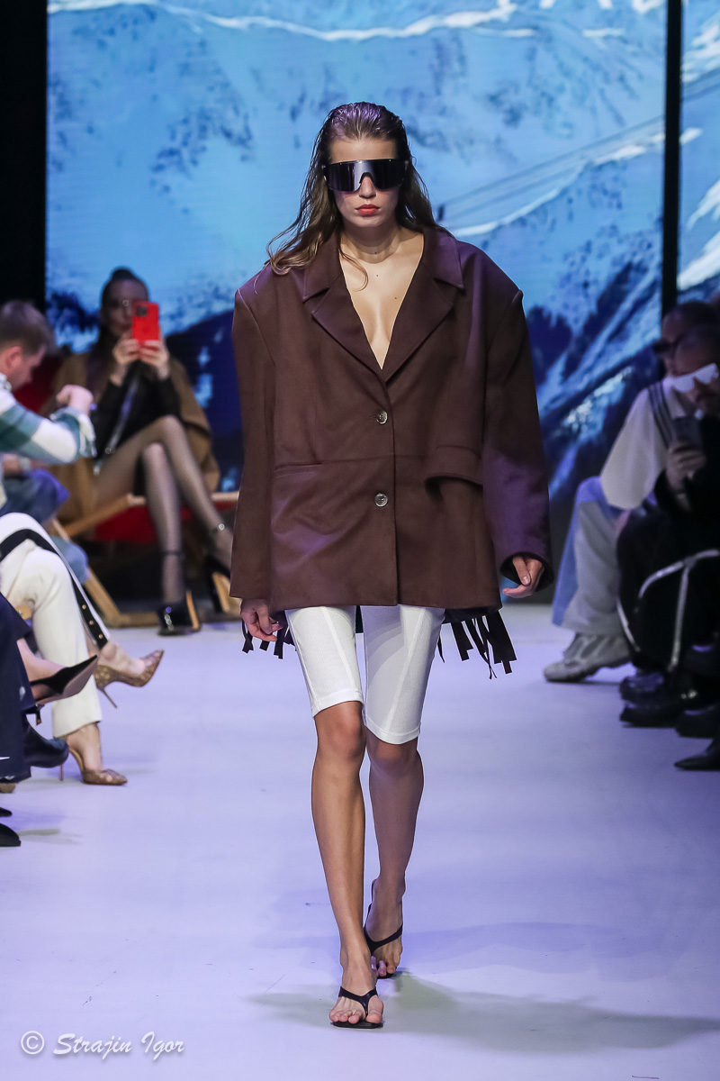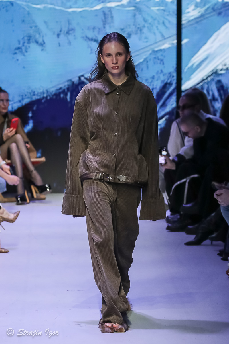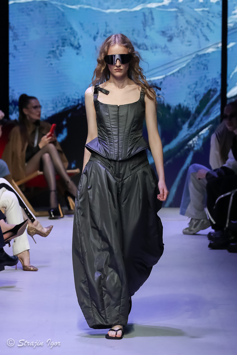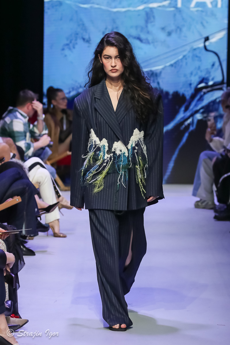 В линейке были показаны комплекты из зимних курток и шорт, утепленные корсеты, трендовые брюки-алладины из непромокаемой ткани и деловые костюмы с вышивкой. Акцентами стали пушистые изделия с яркими принтами, минималистичные надписи, вышивка в виде Альпийских гор и ультрадлинные рукава.